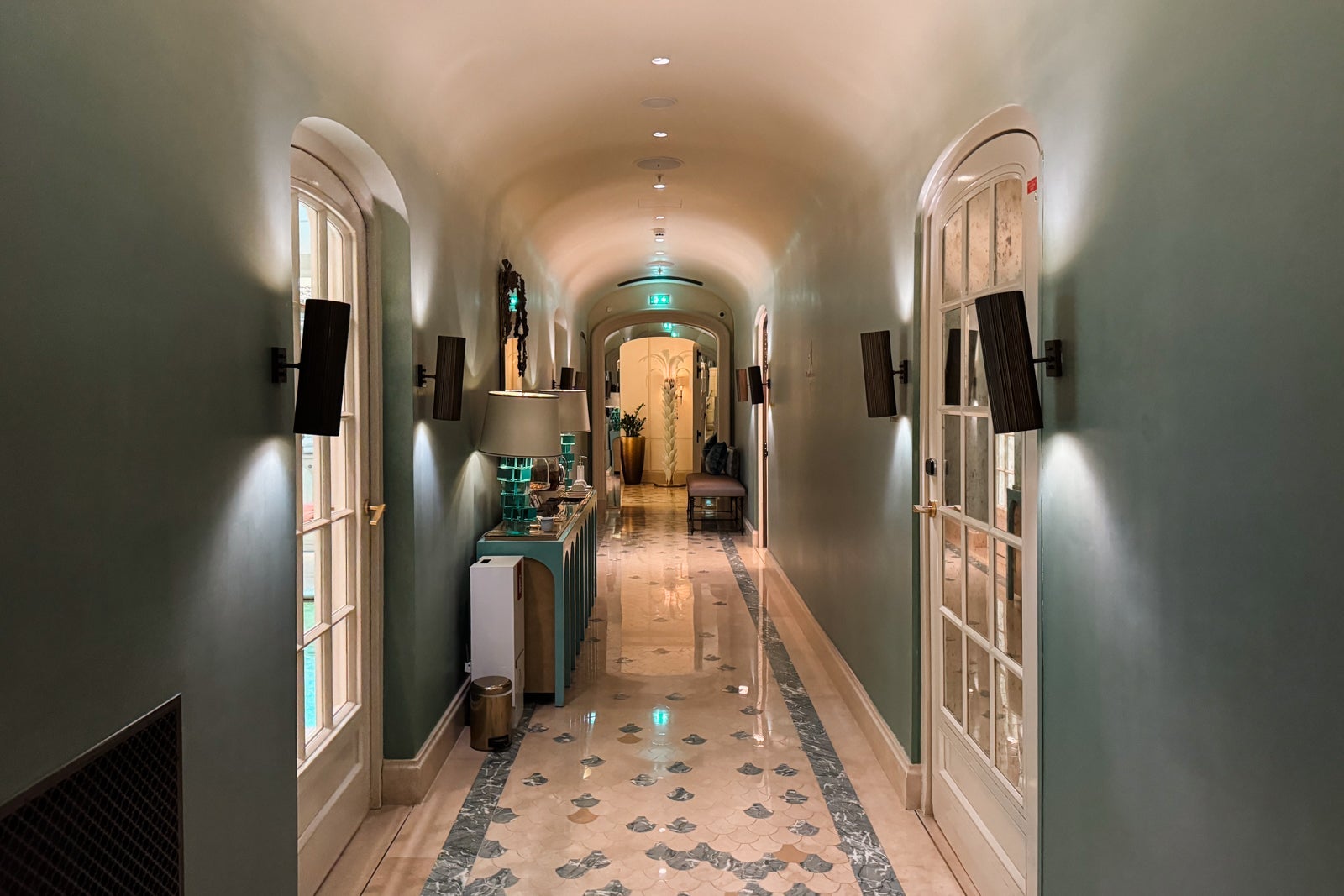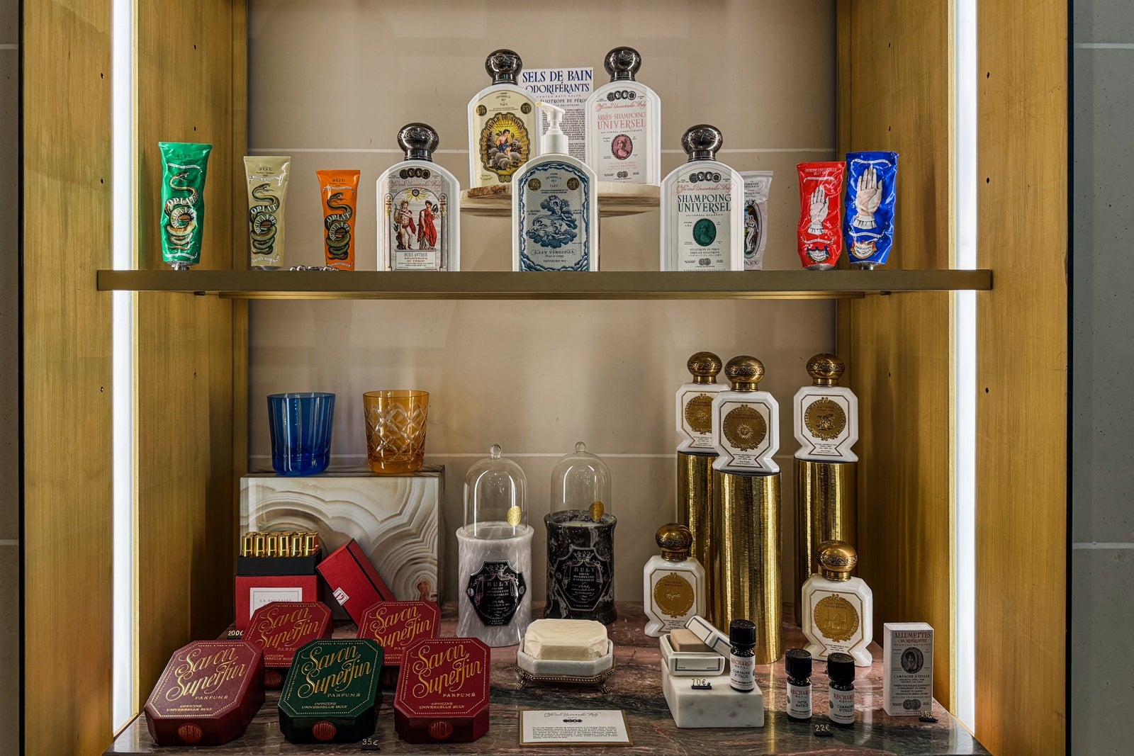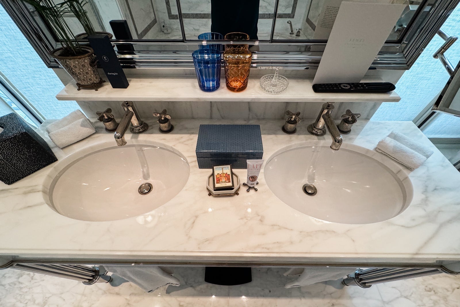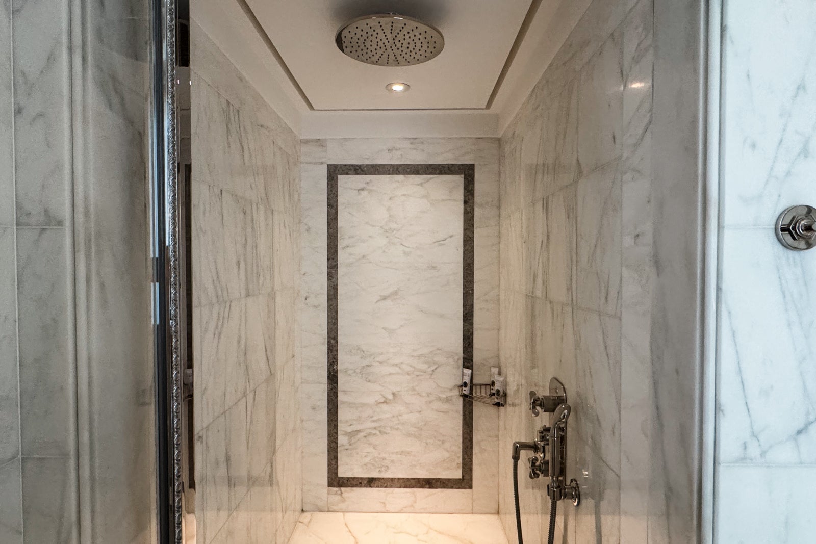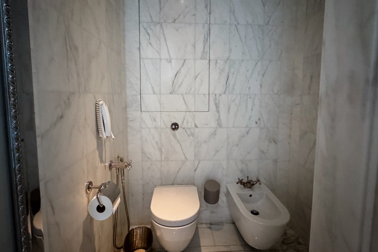 Instead, I took up temporary residence in the all-marble bathroom, sampling the fragrant Officine Universelle Buly products while weighing a bath in the huge soaking tub. I eventually opted for a refreshing rinse in the shower, whose ornate, metal-bordered glass door felt like a baroque picture frame.