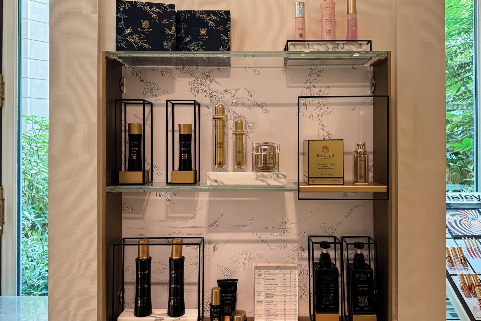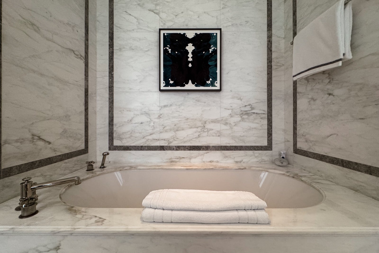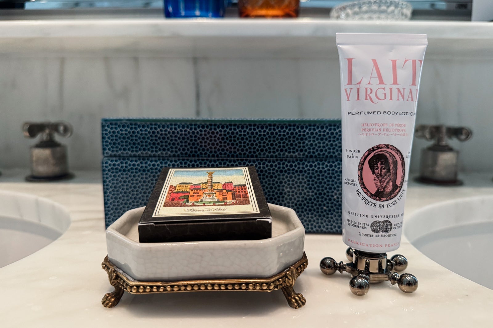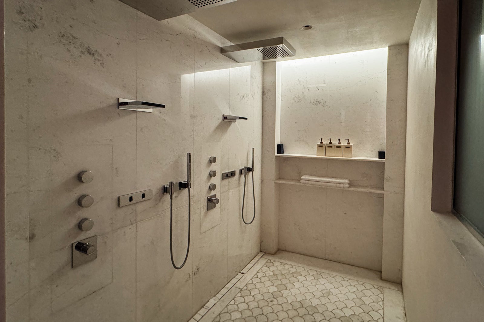 Instead, I took up temporary residence in the all-marble bathroom, sampling the fragrant Officine Universelle Buly products while weighing a bath in the huge soaking tub. I eventually opted for a refreshing rinse in the shower, whose ornate, metal-bordered glass door felt like a baroque picture frame.