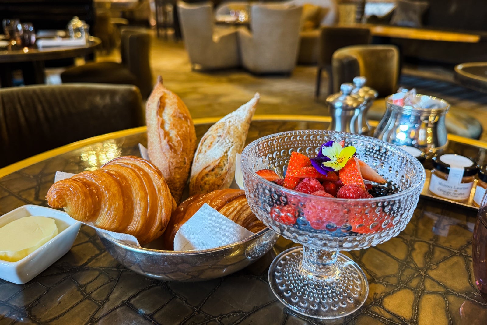 Start your day with petit dejeuner at Jardin d'Hiver, or the winter garden, a light-drenched, lilac-accented parlor just off the lobby. The morning menu includes a Parisian breakfast ($38 per person) of coffee, fresh juices and fruits, and a basket of homemade pastries, including buttery, flakey pain au chocolat. If you don't get your preferred table in the morning, pass by in the afternoon for tea service, including mouthwatering pastries by chef Matthieu Carlin.
