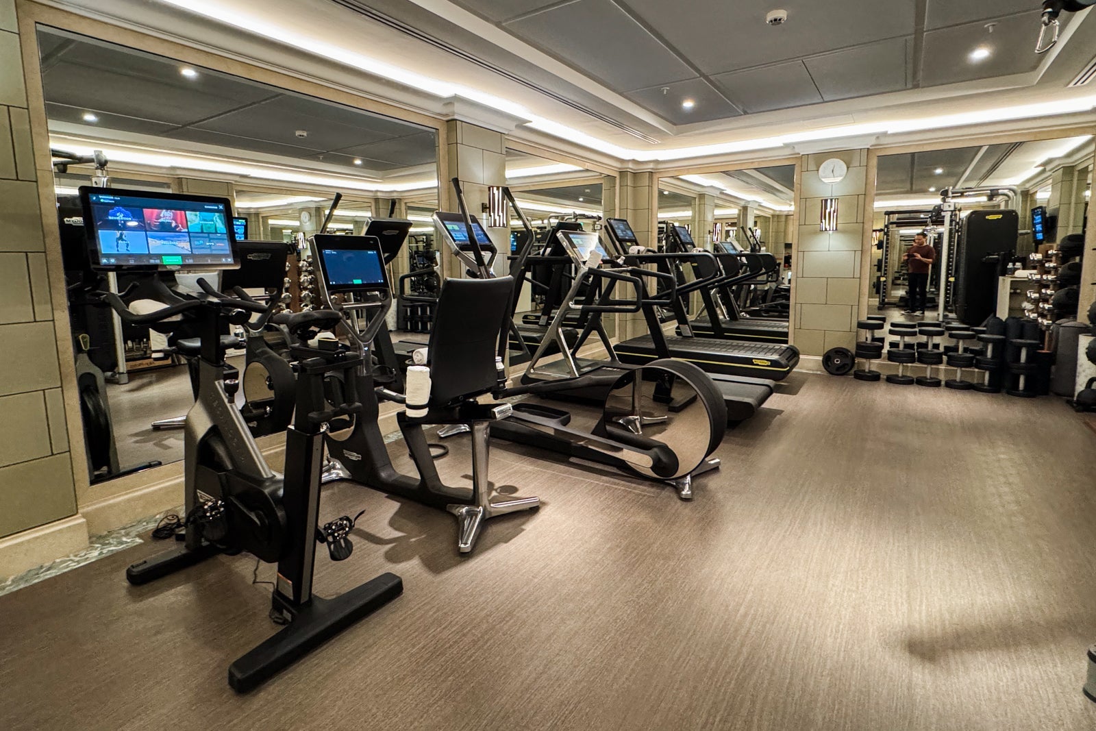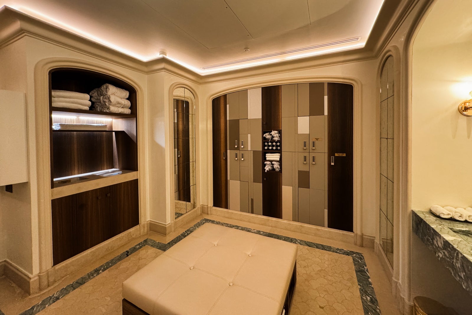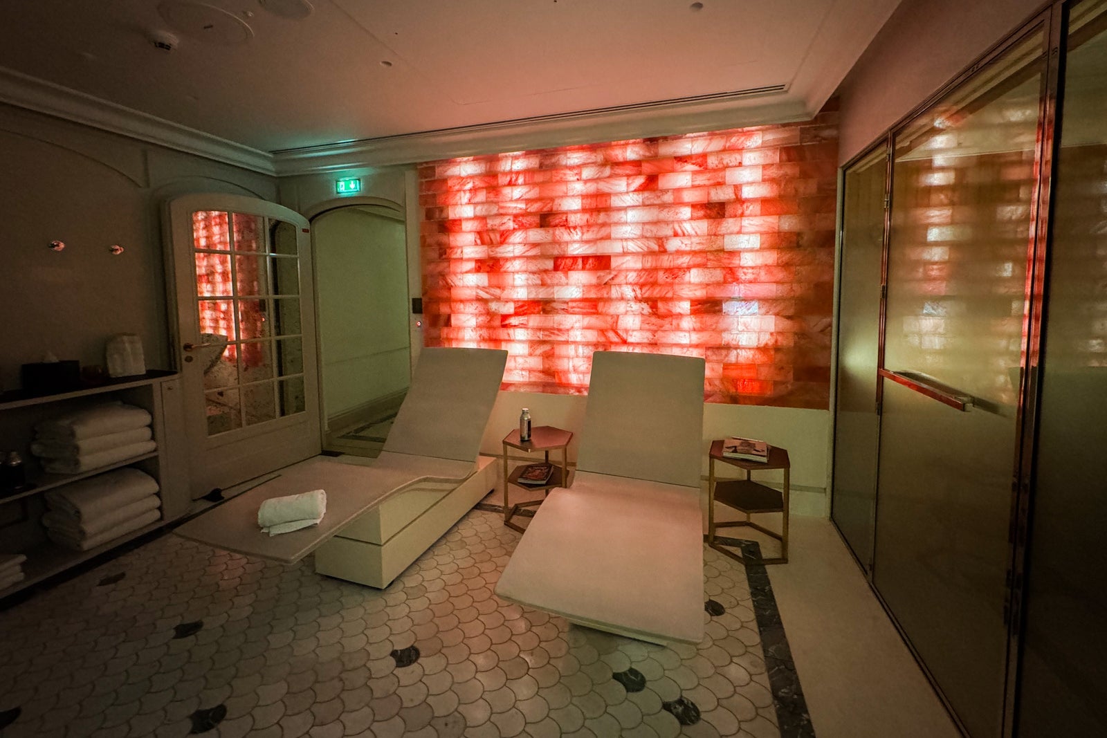 Here, guests are transported (down one level) to an aquatic-themed retreat with a compact fitness center, men's and women's locker rooms and a coed hammam and sauna with Himalayan pink salt walls.