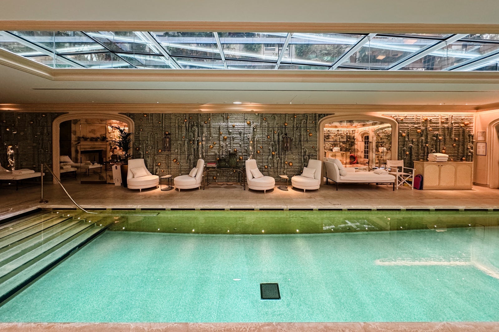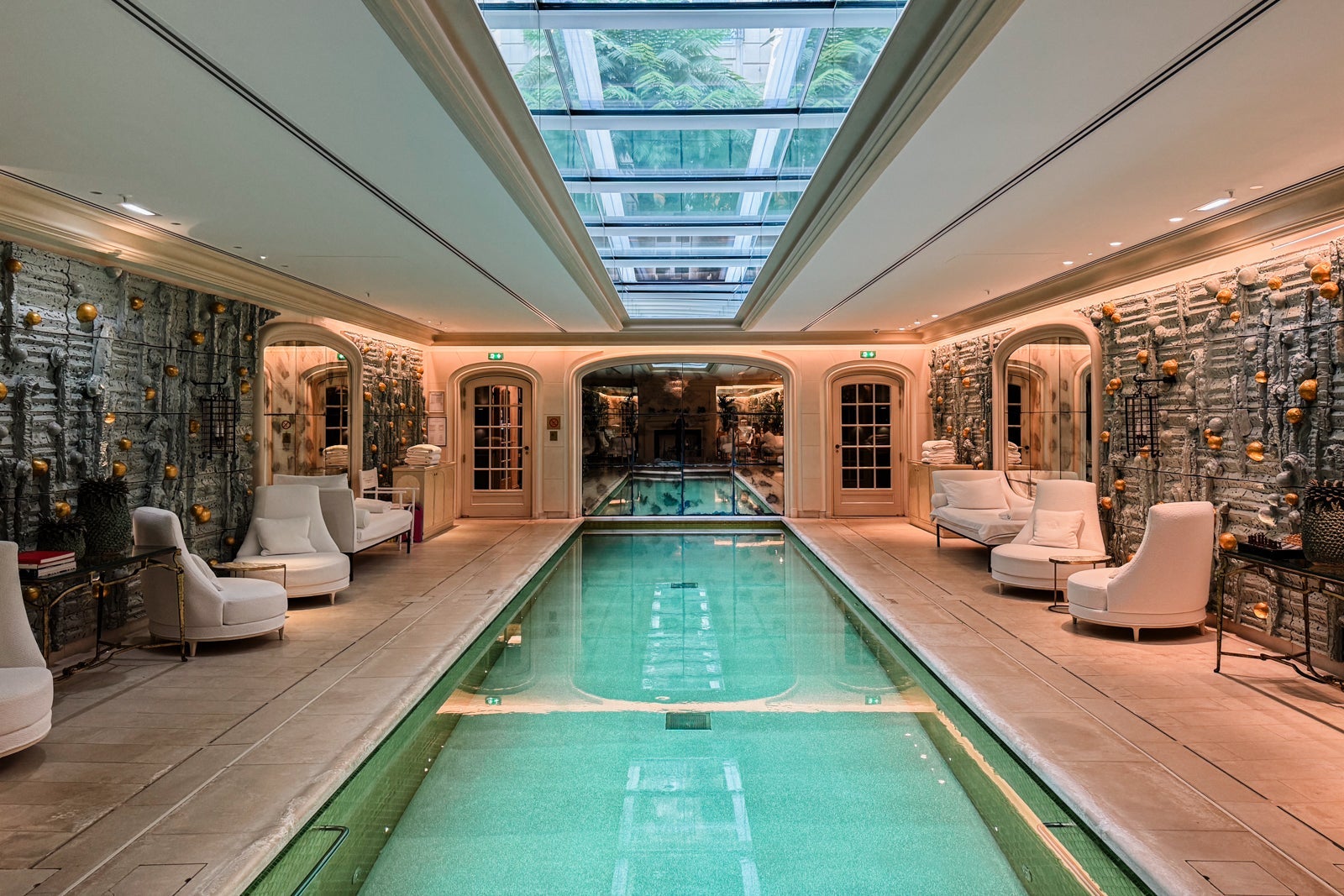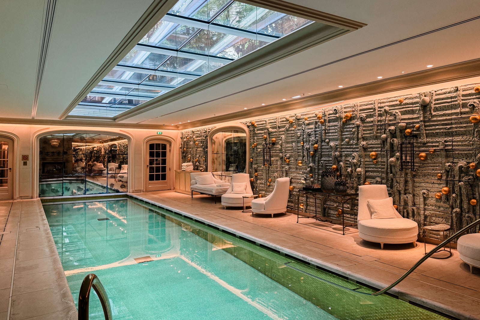 The piece de resistance, however, is the skylit pool, whose aquamarine and gold ceramic walls comprise an installation by artist Peter Lane and where the sumptuous seating areas naturally lend themselves to languid afternoons.