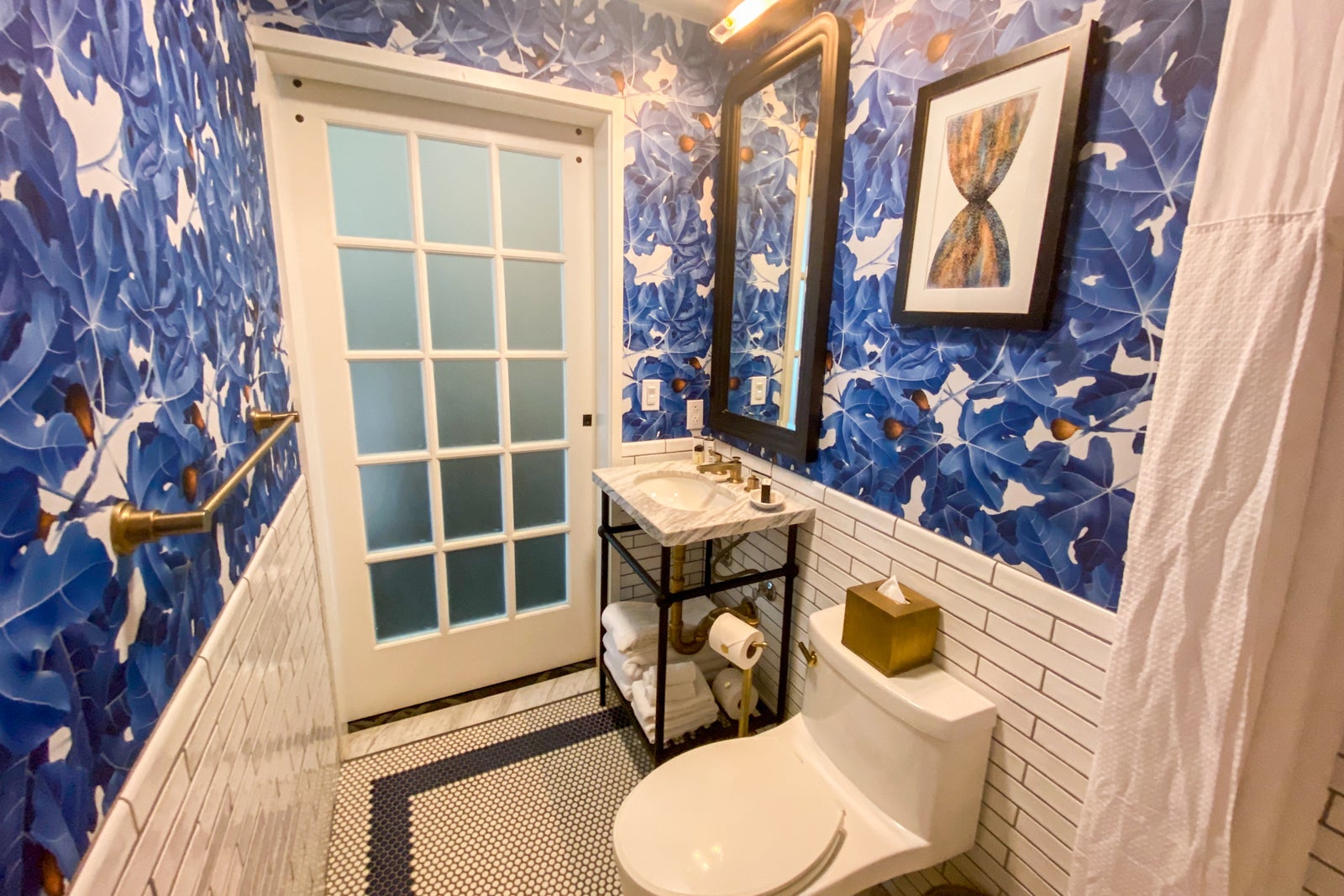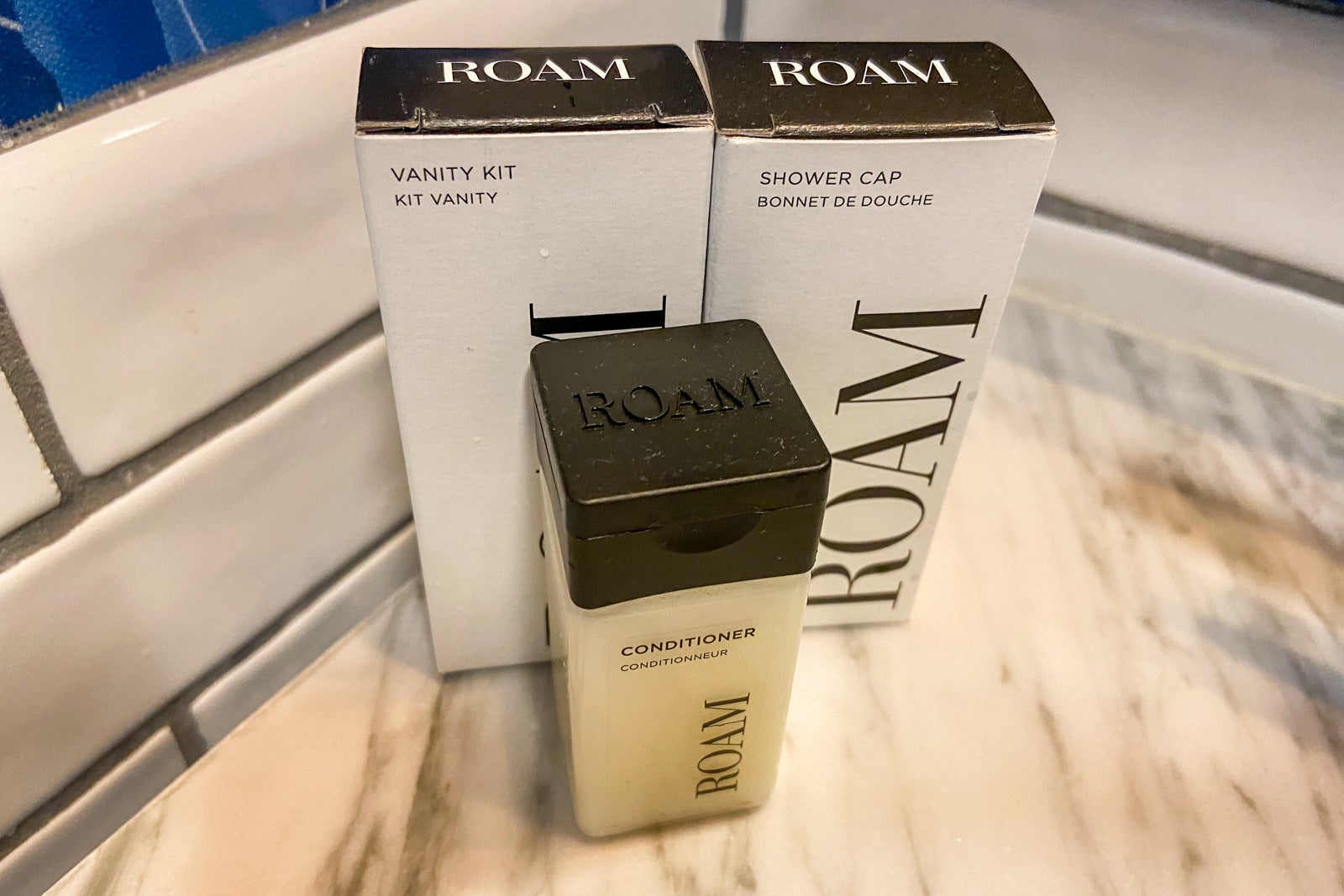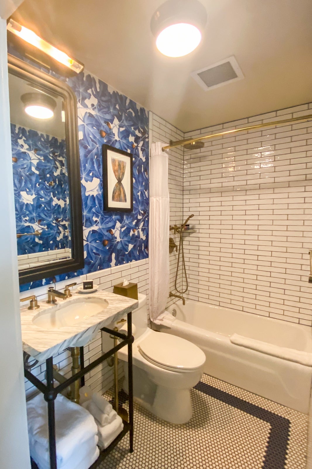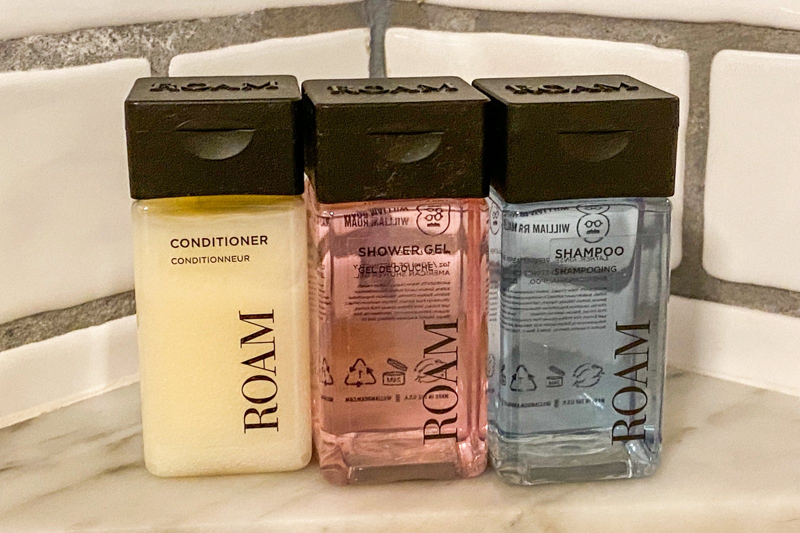 The bathroom was small, but clean. While some might find its decor a bit busy, I loved the blue wallpaper, along with the blue-and-white tile floor and the subway tiles on the wall. What I didn't like was the rain shower head/hand-held shower. It took me a while to know which knobs to turn to control the shower heads and temperature, and my travel companion agreed. Normally I love the rain shower heads, but I didn't like how this one couldn't be moved. You had to almost touch the front shower wall to feel the water on your head and body. Lord help you if you're taller that six feet (which my travel companion was) -- you will not have a good bathing experience unless you resort to the hand-held shower. The hotel offered Roam shampoo, conditioner and shower gel on a small shelf in the front of the shower.