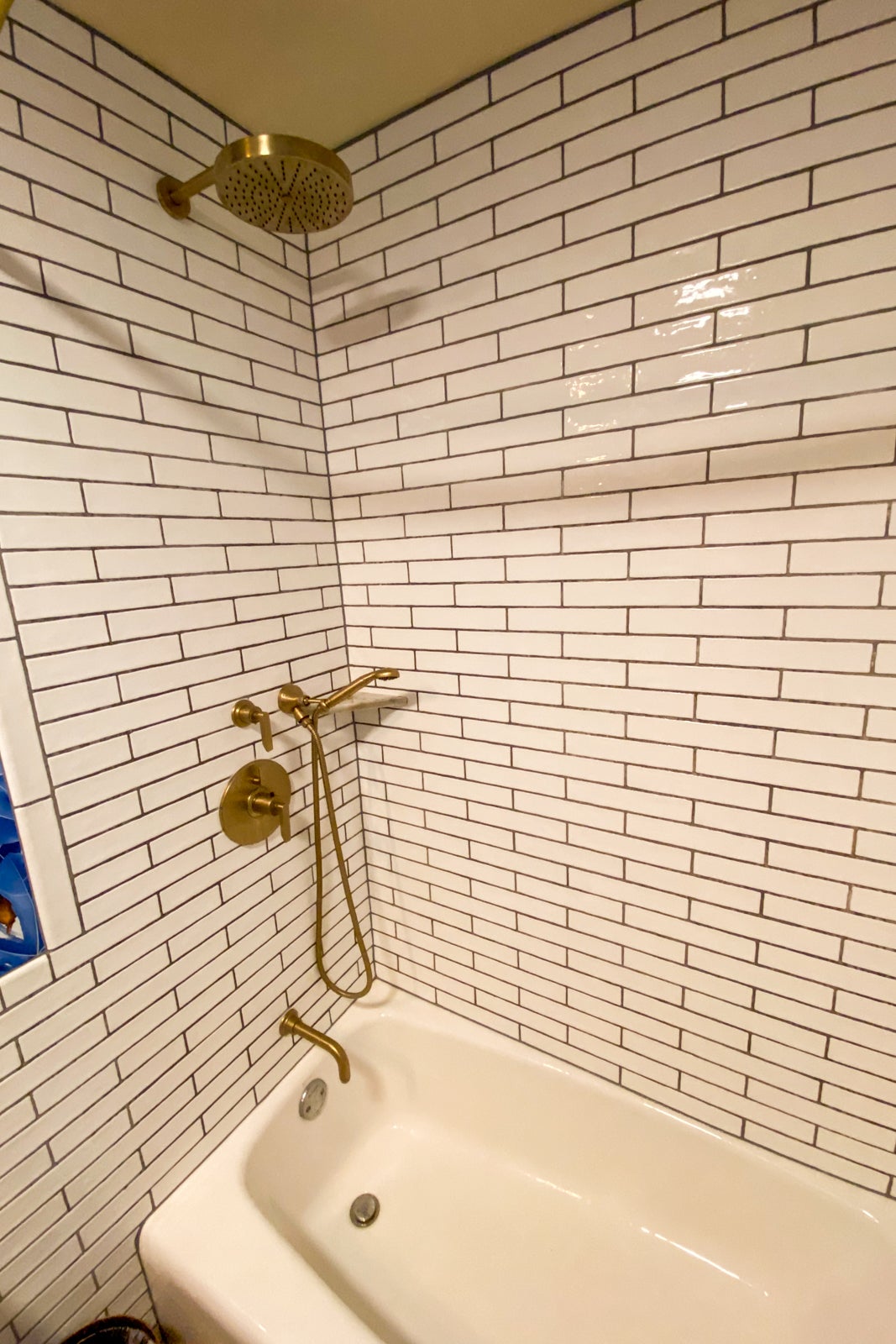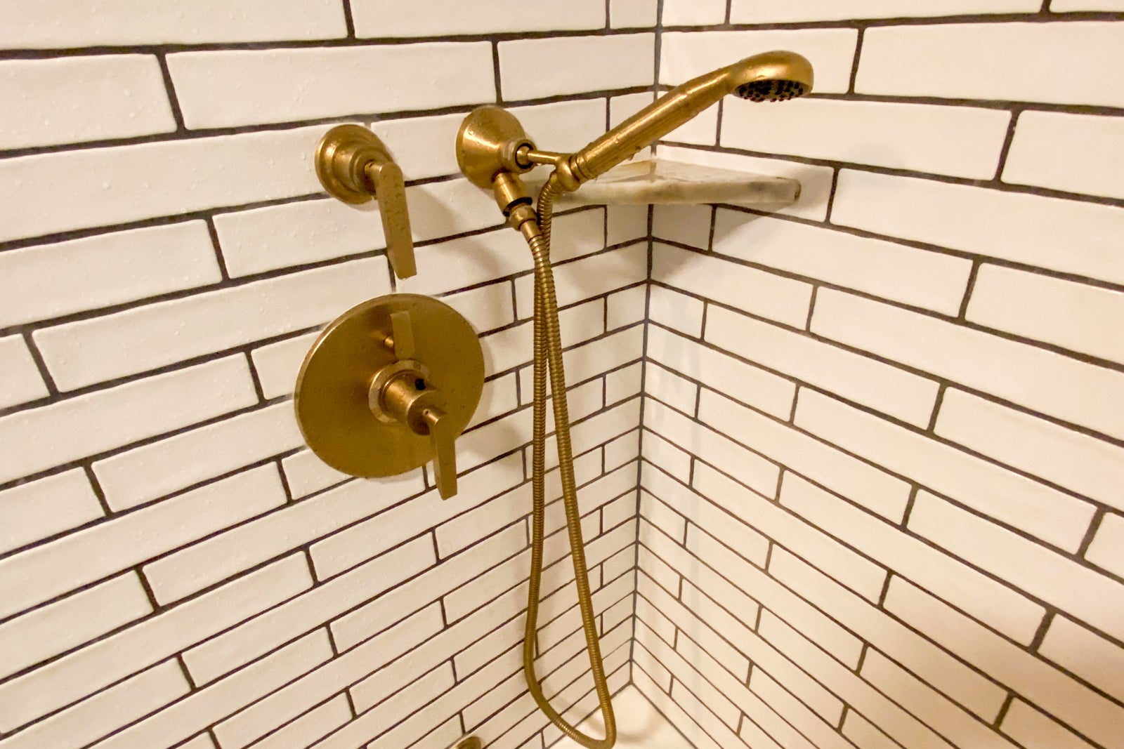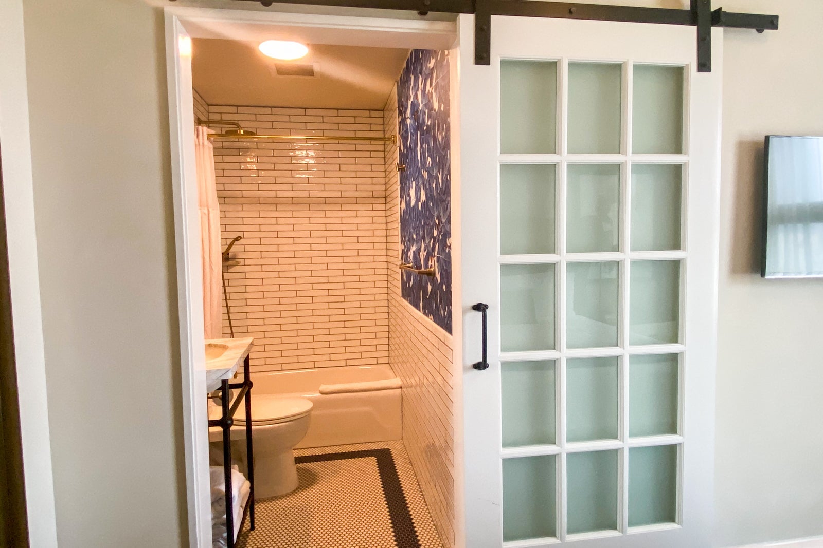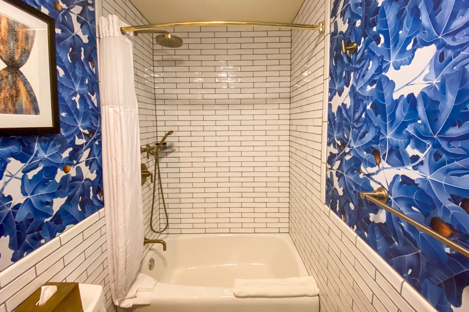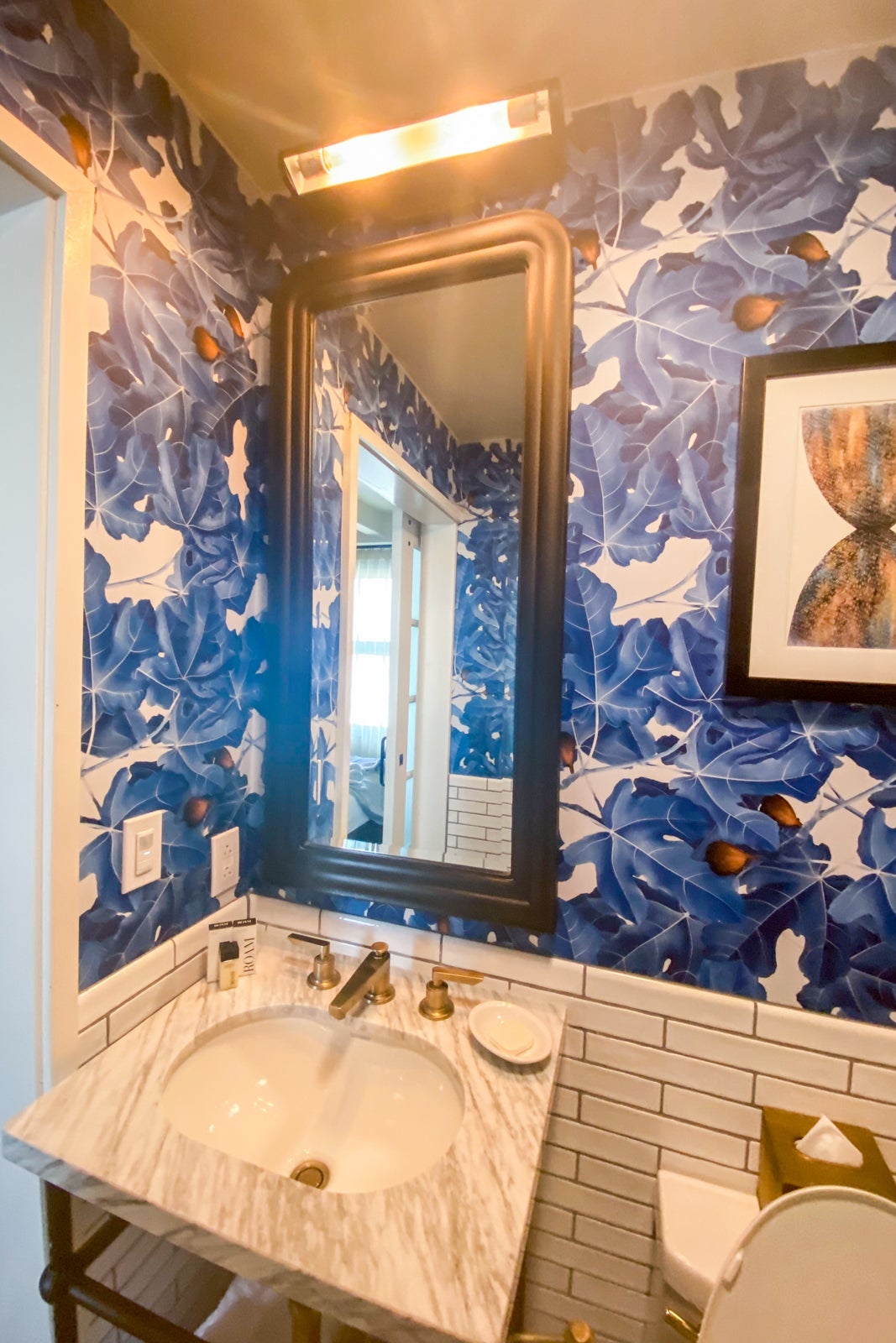 The bathroom was small, but clean. While some might find its decor a bit busy, I loved the blue wallpaper, along with the blue-and-white tile floor and the subway tiles on the wall. What I didn't like was the rain shower head/hand-held shower. It took me a while to know which knobs to turn to control the shower heads and temperature, and my travel companion agreed. Normally I love the rain shower heads, but I didn't like how this one couldn't be moved. You had to almost touch the front shower wall to feel the water on your head and body. Lord help you if you're taller that six feet (which my travel companion was) -- you will not have a good bathing experience unless you resort to the hand-held shower. The hotel offered Roam shampoo, conditioner and shower gel on a small shelf in the front of the shower.