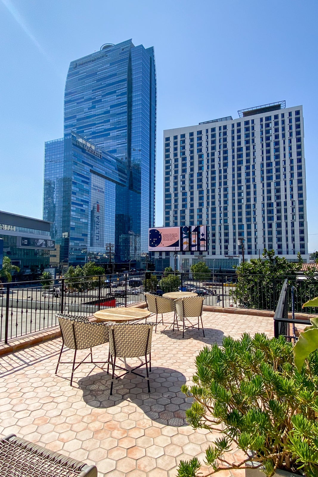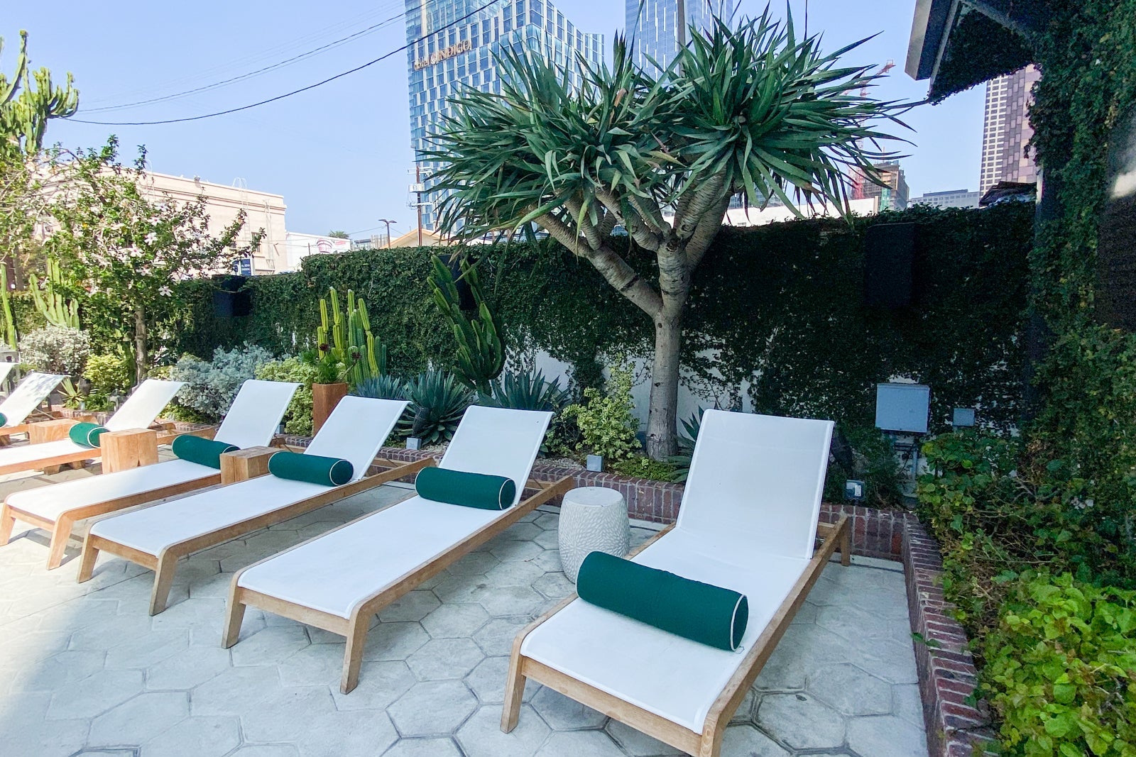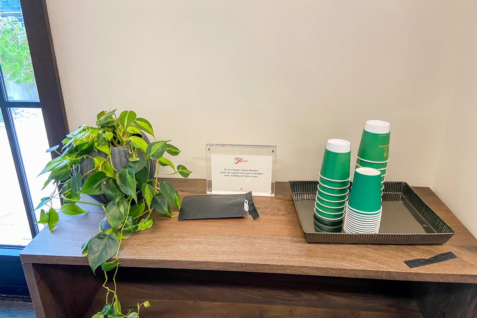 The hotel had a gym, although it was very small. It included a lone Peloton bike (beloved by TPG staff), a weights system, kettlebells, free weights, COVID-19 kits (face mask, wipes, hand sanitizer and gloves), plus cold and room-temperature water. Right past the gym was an outdoor seating area with great views of downtown Los Angeles. The entrance wasn't marked and the door was very narrow, making it easy to miss. However, the weather was perfect to enjoy this gem of a space.