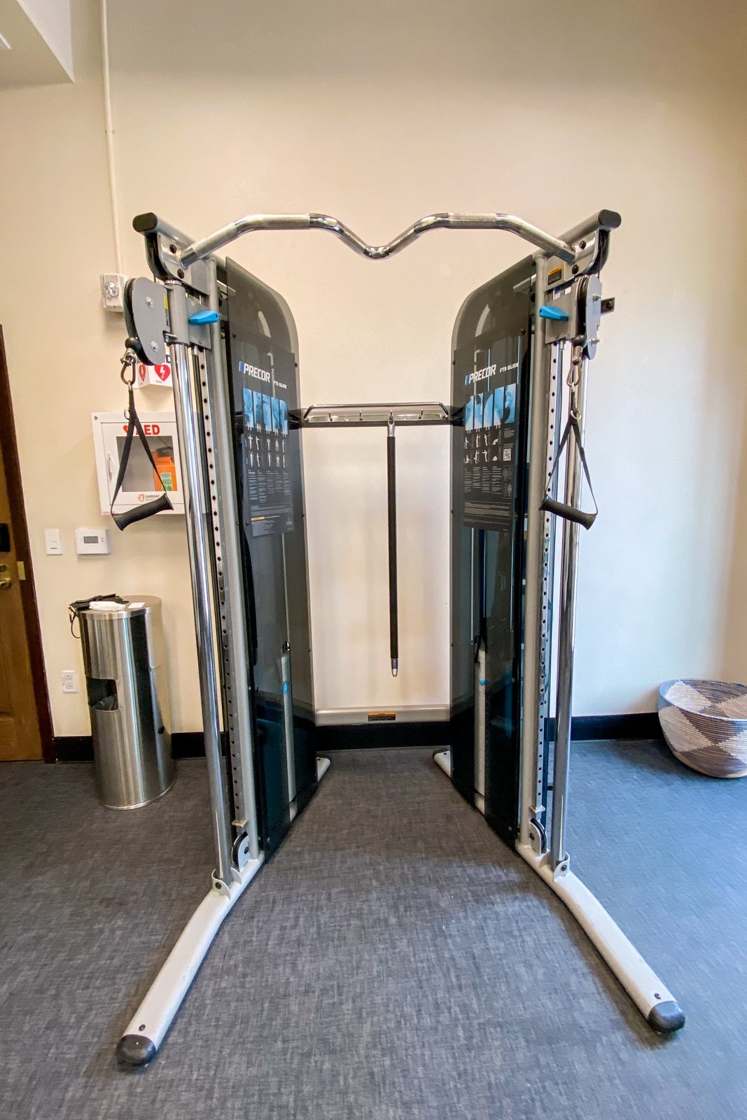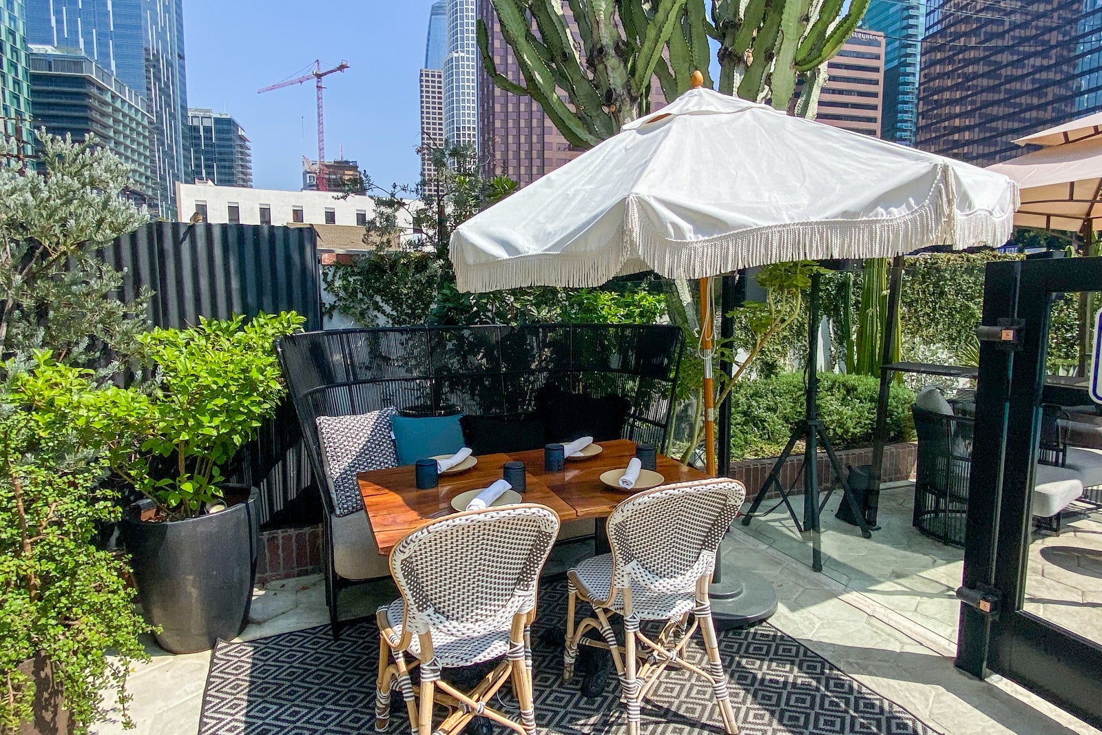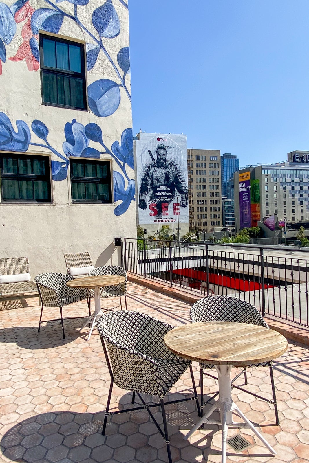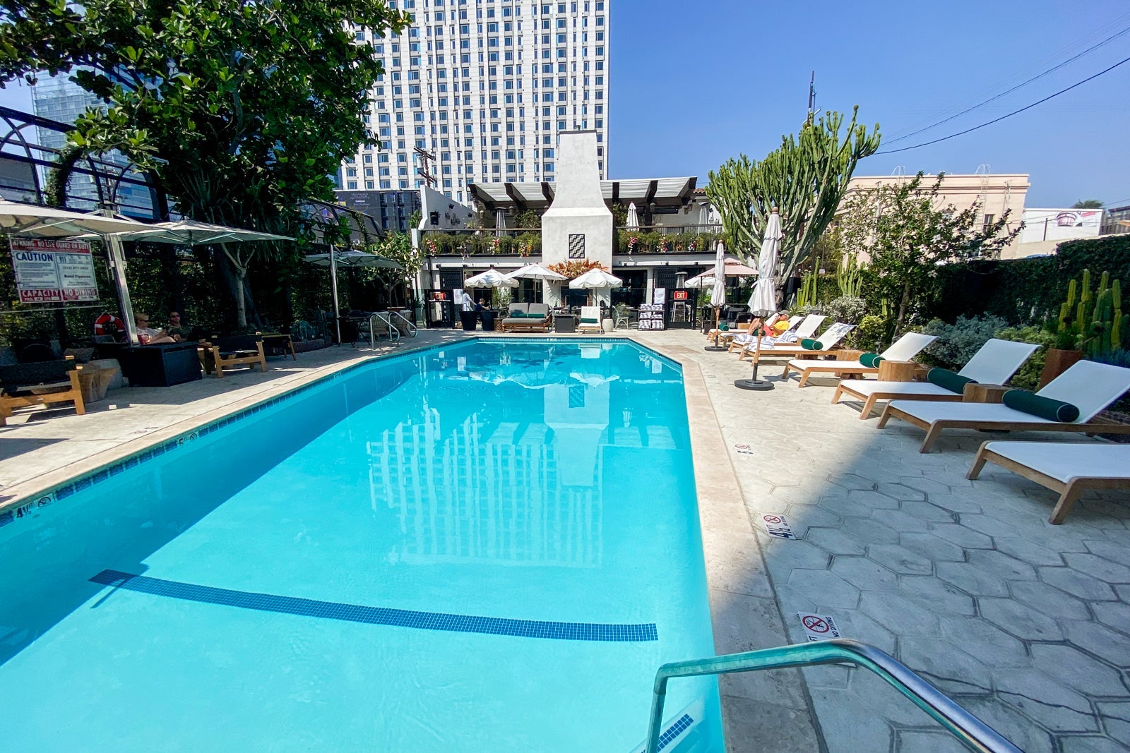The hotel had a gym, although it was very small. It included a lone Peloton bike (beloved by TPG staff), a weights system, kettlebells, free weights, COVID-19 kits (face mask, wipes, hand sanitizer and gloves), plus cold and room-temperature water. Right past the gym was an outdoor seating area with great views of downtown Los Angeles. The entrance wasn't marked and the door was very narrow, making it easy to miss. However, the weather was perfect to enjoy this gem of a space.
