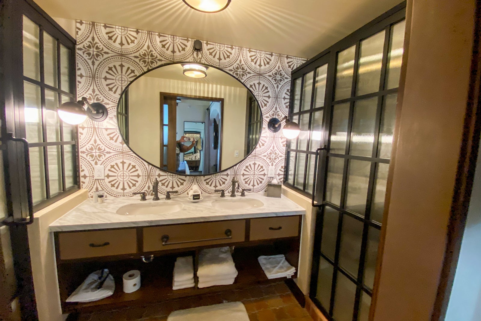 Unlike my room, there was a large desk that could be used for work or even double as a bar if you have friends drop by. There was a curtain that could be pulled between the king-sized bed and the sitting area for privacy. There was a full closet, with a safe inside. The bathroom was far more spacious, with a double sink, a large shower and a separate space, behind a door, for the toilet.