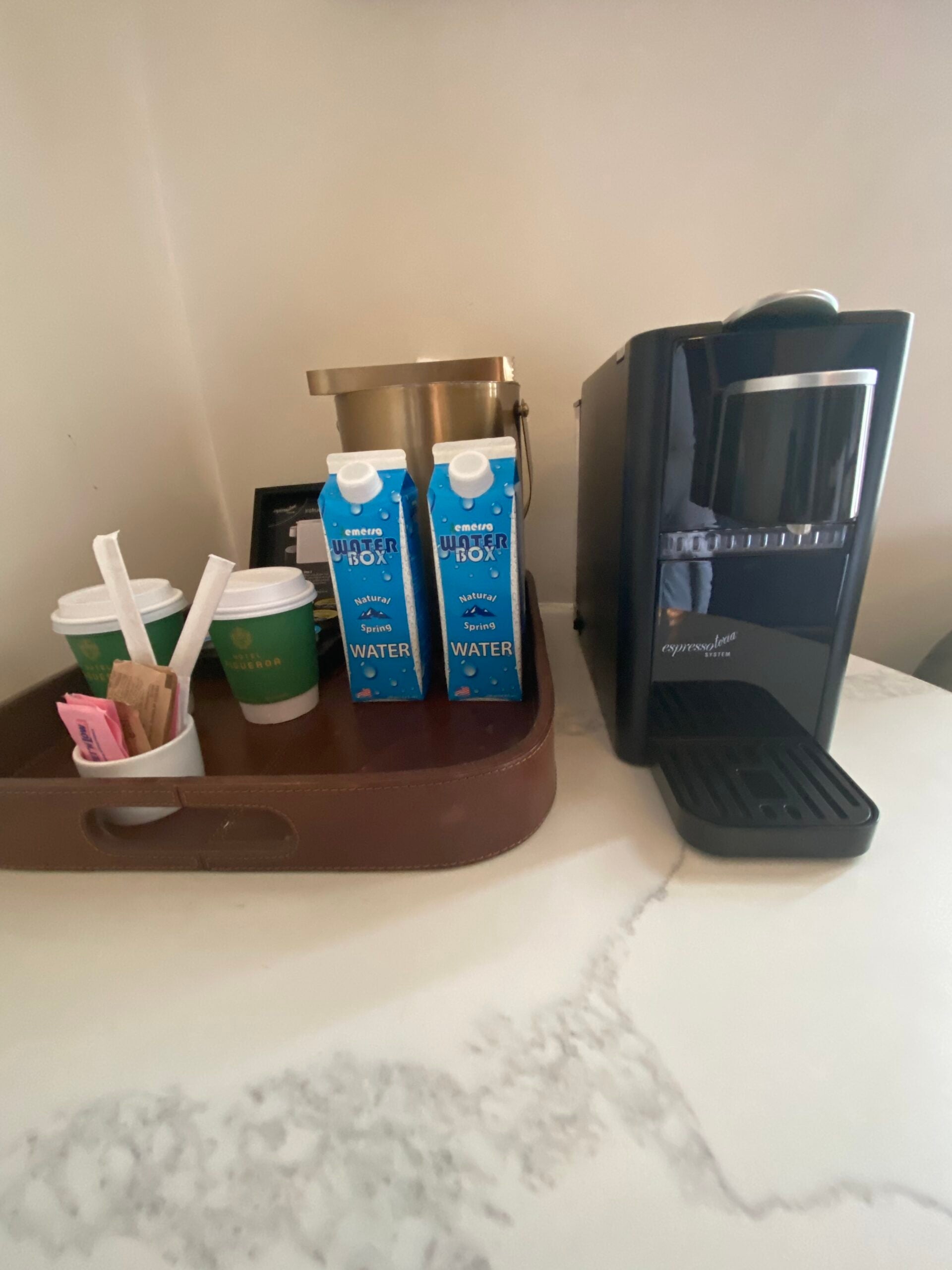 A small television hung on the wall in front of the bed. Crammed in the corner was a small marble table that was taken up by two boxes of water, an Esspressotoria coffee machine, coffee pods, cream, sugar, artificial sweetener and stir sticks. I was able to use my iPad and keyboard there, but I had to put items on the floor to make room on the table for my MacBook Air laptop. There was no minibar or refrigerator in the room.
