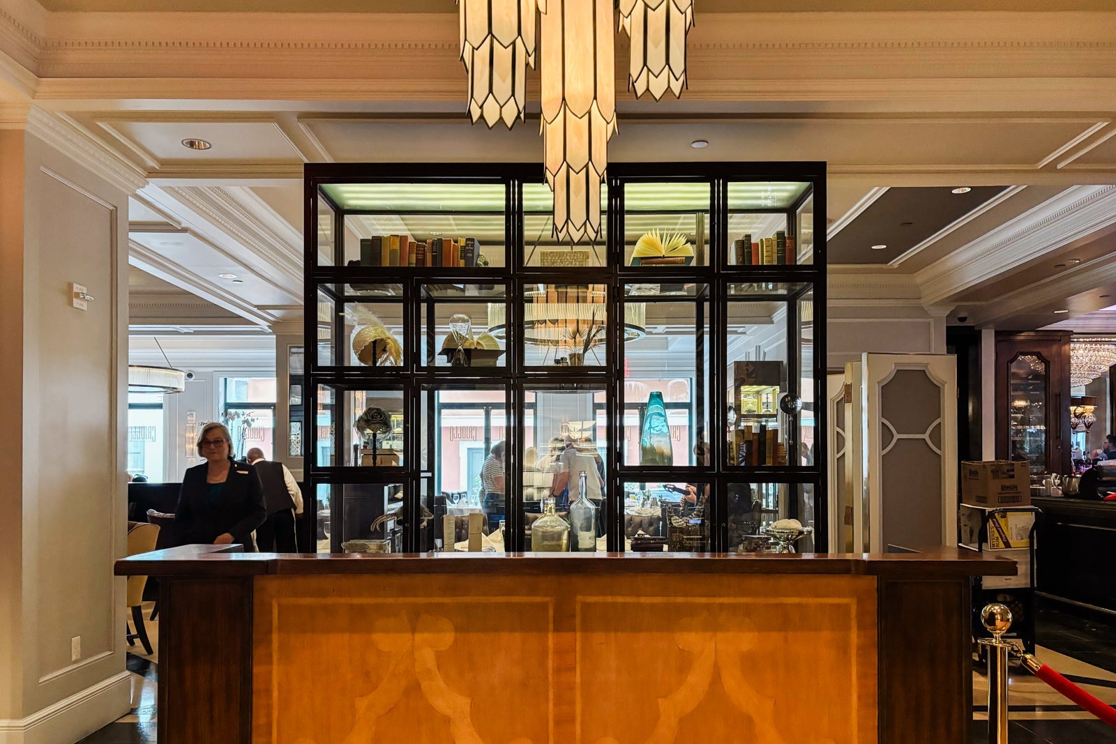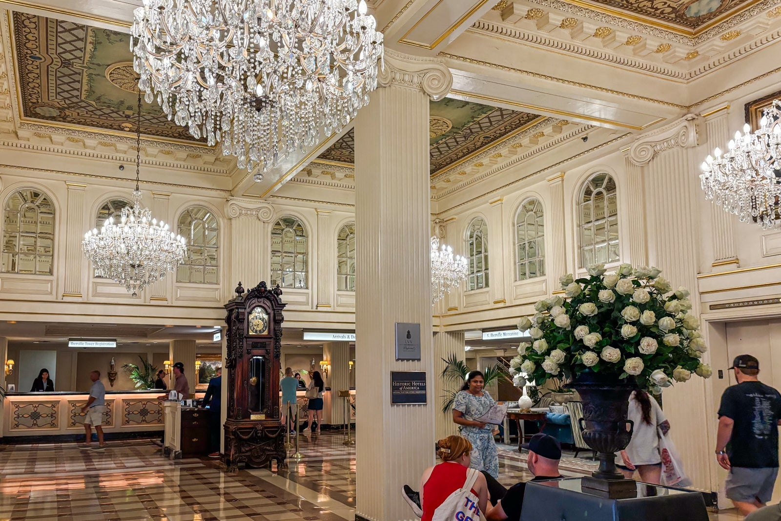Once our taxi arrived at the hotel, we were greeted by one of Hotel Monteleone's personable doormen, Cedric, who warmly welcomed us and helped open the door to the lobby. From the grand chandeliers and columns to multiple cozy seating areas, we took note of the opulent design details as we walked into the lobby. The area felt elevated and luxurious, but it wasn't so stuffy that it felt uncomfortable.