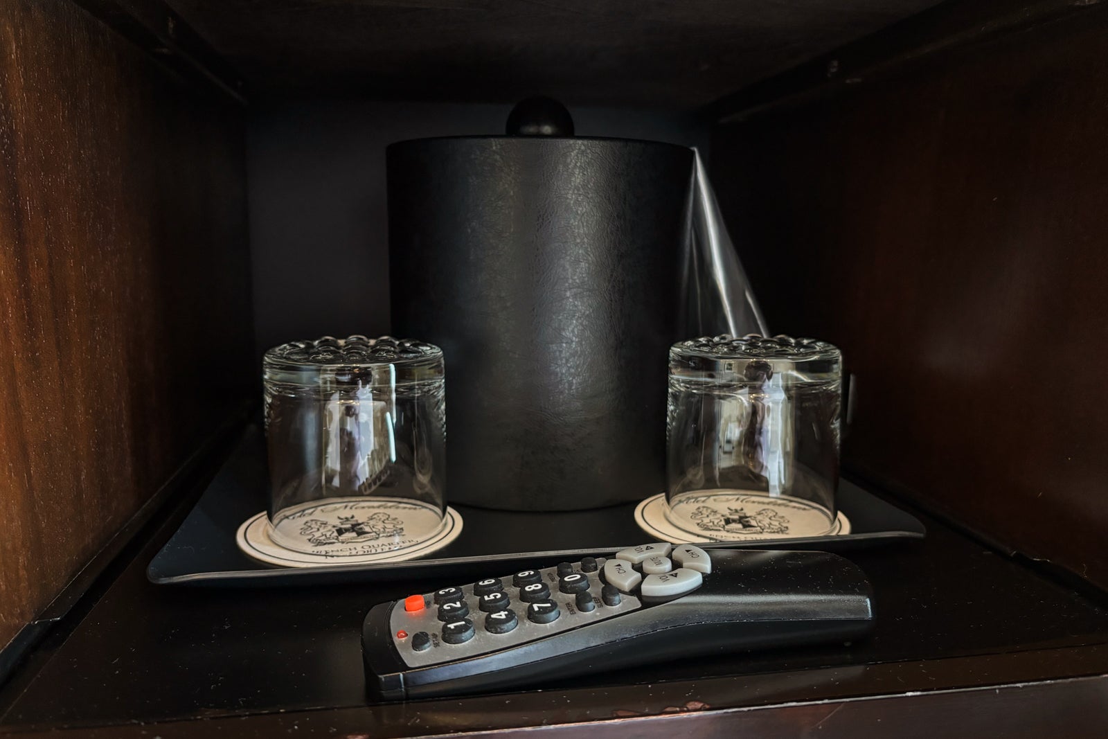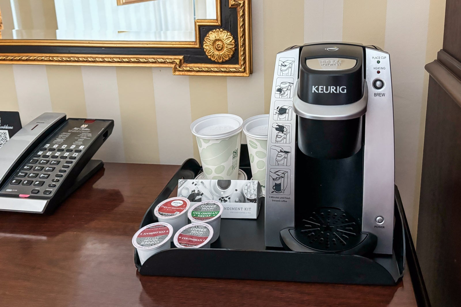 Amenities were standard and included a coffee machine, two boxes of water in a small refrigerator, a safe, a docking station for extra plugs, an iron and ironing board, an umbrella, two robes, extra linens, and about 10 hangers. Even though the room wasn't exceptionally large, it didn't lack storage space for my partner and me on a three-night trip.
