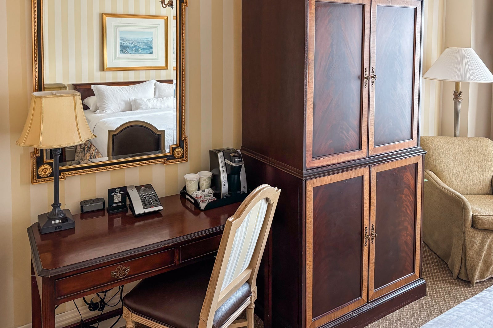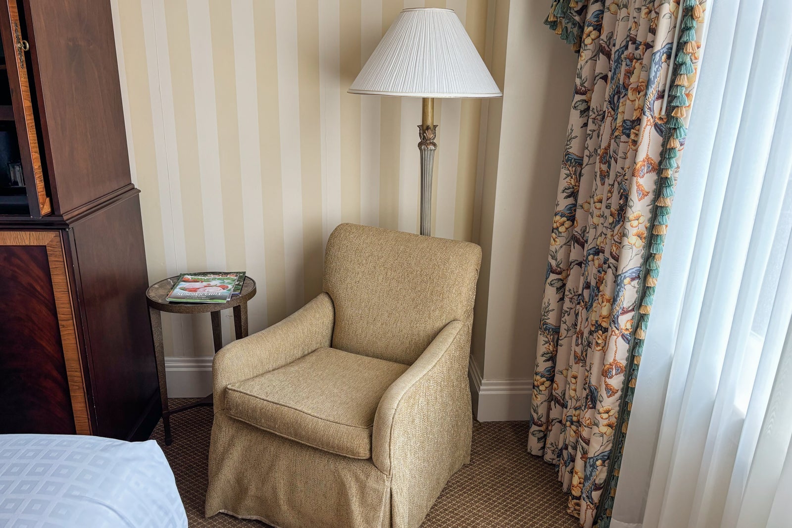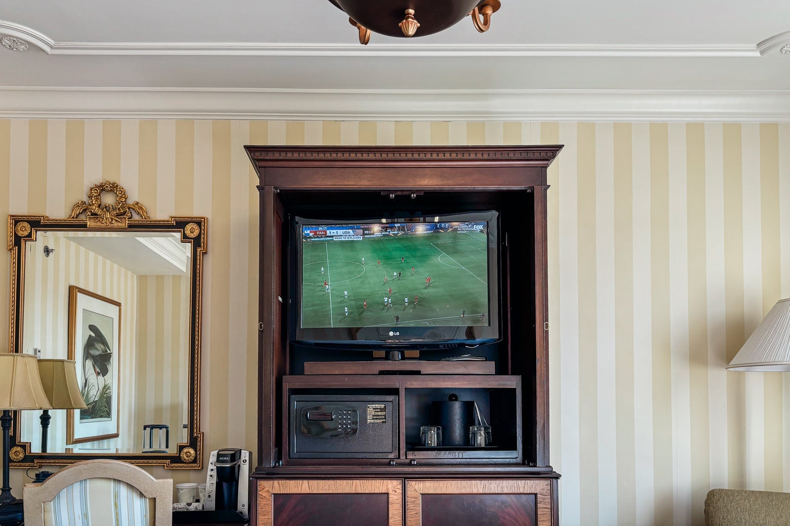 The room had a classic, cozy vibe and tasteful details paired with modern amenities. The striped wallpaper's golden hue complemented the matching floral curtains and bed skirt. Another touch I appreciated was that the TV could be put away within a credenza when we weren't channel surfing.