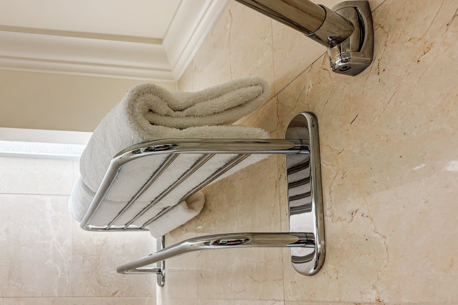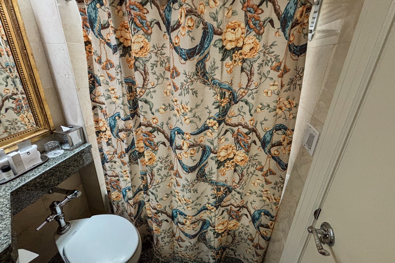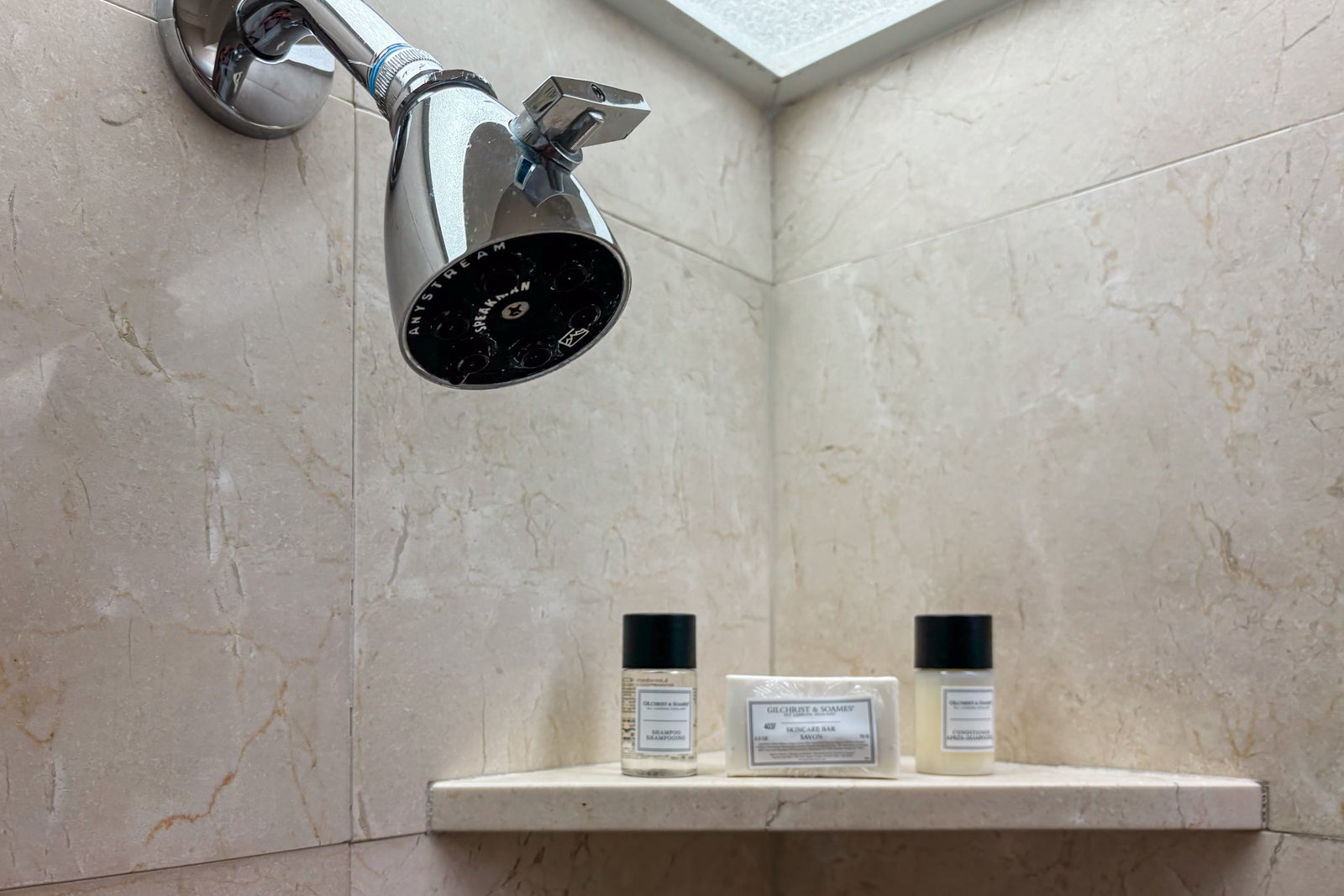 The bathroom was clean and had everything we needed, but it was far from spacious. A marble countertop held the sink and essentially all of the counter space, which wasn't much. It was challenging to find enough space to set things as my partner and I attempted to place our personal toiletries alongside the provided ones.