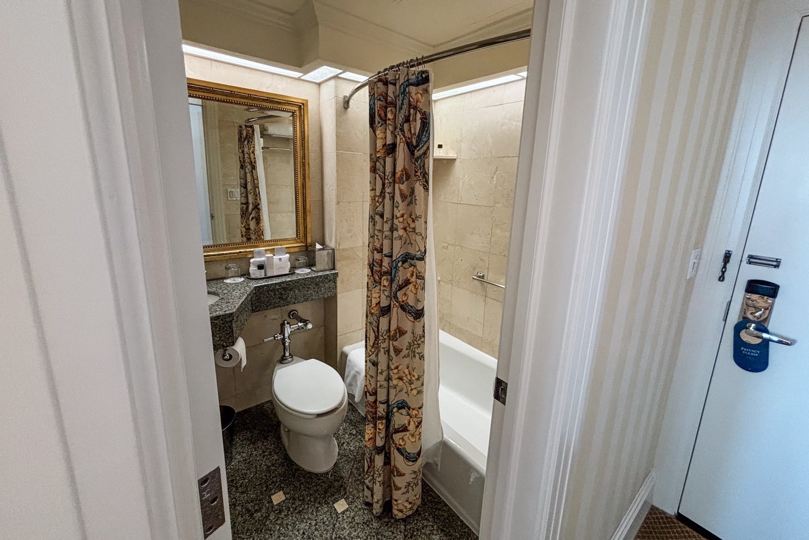 There was a gold-framed mirror over the sink, as well as a shower, a tub and a toilet. The shower curtain matched the curtain in the bedroom, which was a cute design detail. Because the bathroom was so small, the door, toilet and tub were all extremely close together, which caused showering to feel cramped.