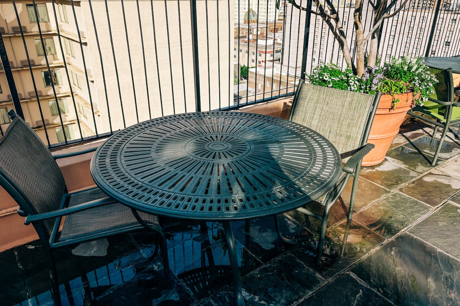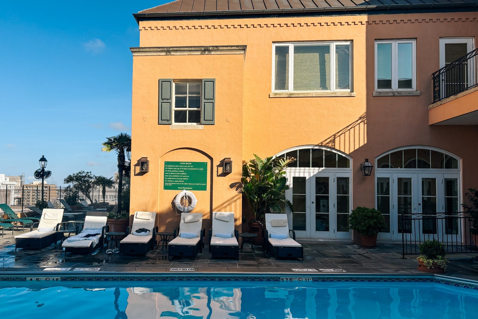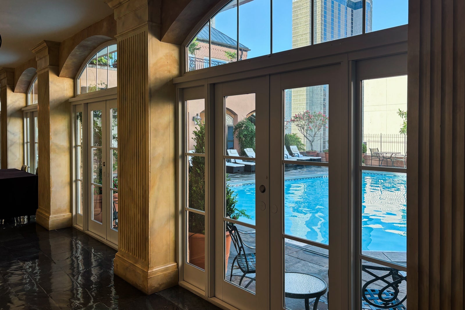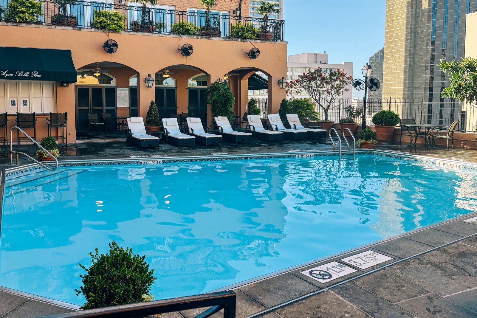 Hotel Monteleone's pool is on the roof, adjacent to the fitness center. The area is well decorated and inviting, with multiple potted plants and plenty of seating, matching the vibe of the rest of the hotel.