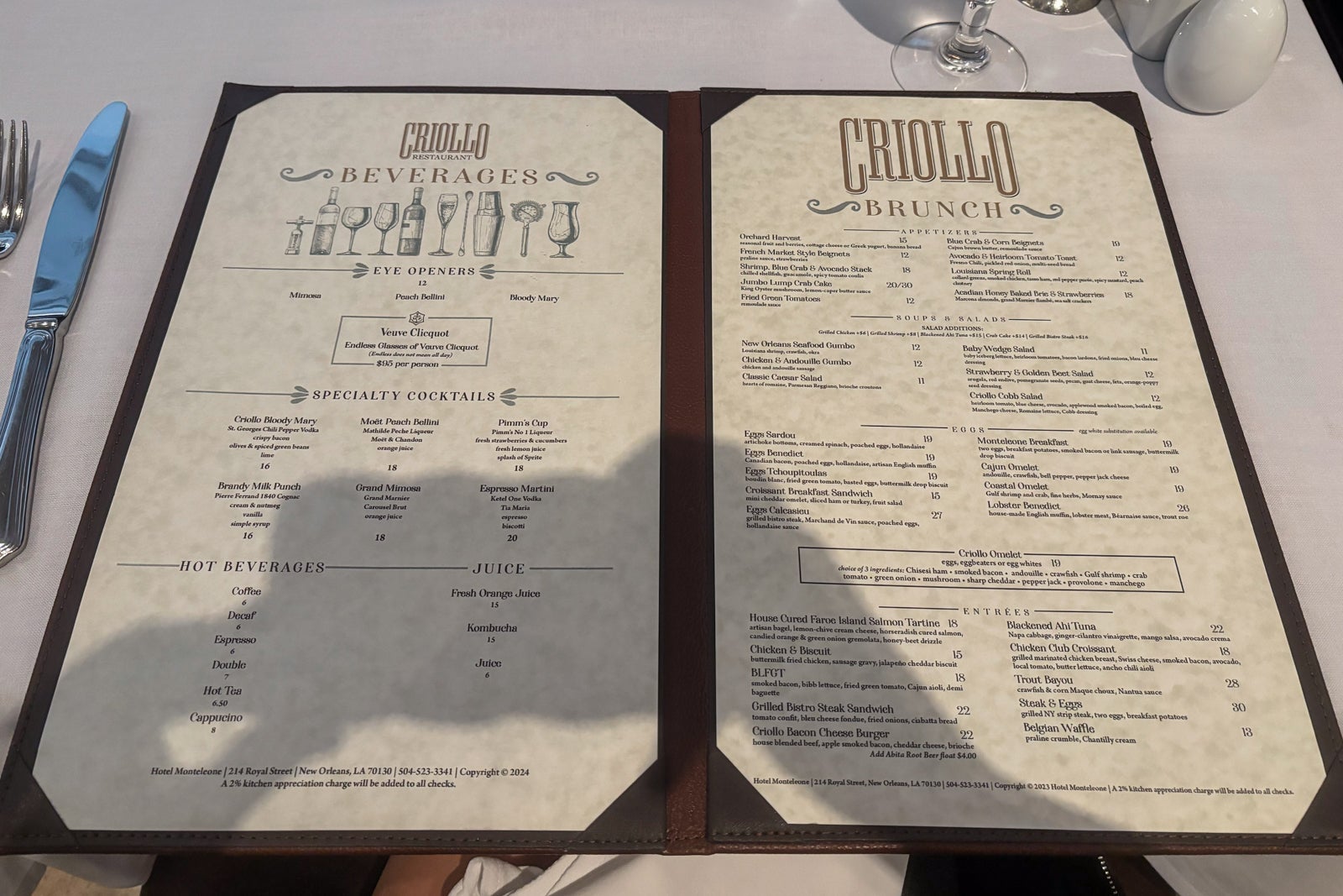 Hotel Monteleone's on-site restaurant, Criollo, is open for breakfast, lunch and dinner. On Saturday and Sunday, it hosts a weekend jazz brunch with live performances.