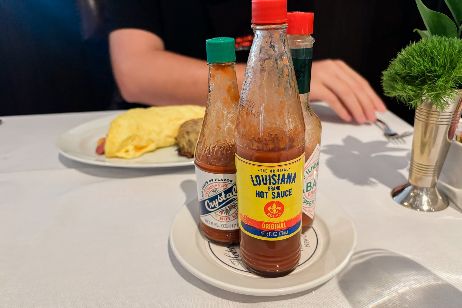 As soon as we finished the appetizers, our main courses were ready. I selected the avocado and heirloom tomato toast appetizer ($12) as a main, and my partner chose a Cajun omelet ($19), which came with a side of hash browns. We also received a solid selection of hot sauce.