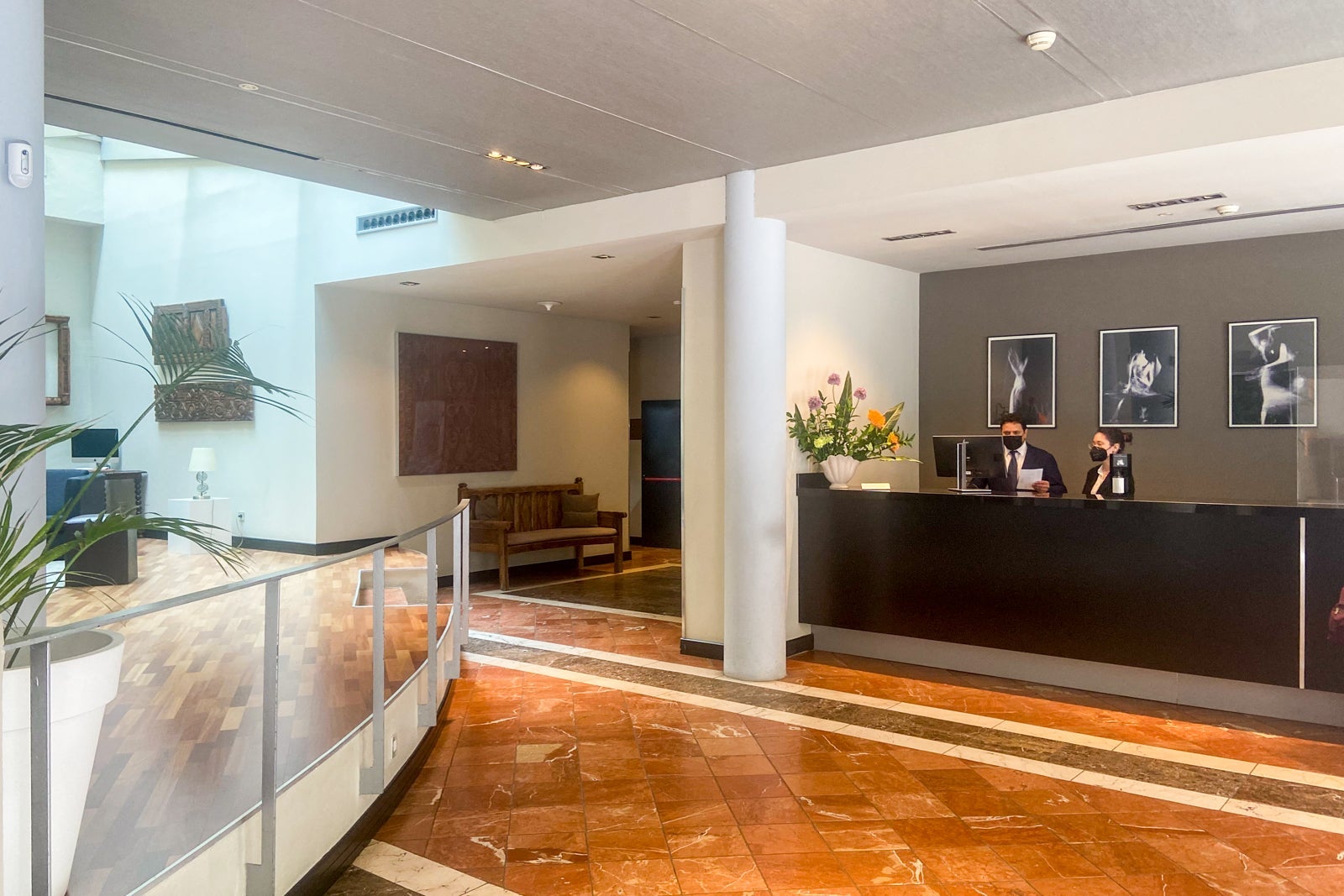Walking into the lobby, you'd never guess this hotel was a former monastery. The entrance was unassuming, looking more like a typical business hotel than a building filled with history. The lobby was open, with various sitting areas, and there was cold water and cups at the entrance — helpful after you've just returned from walking around on a warm day.