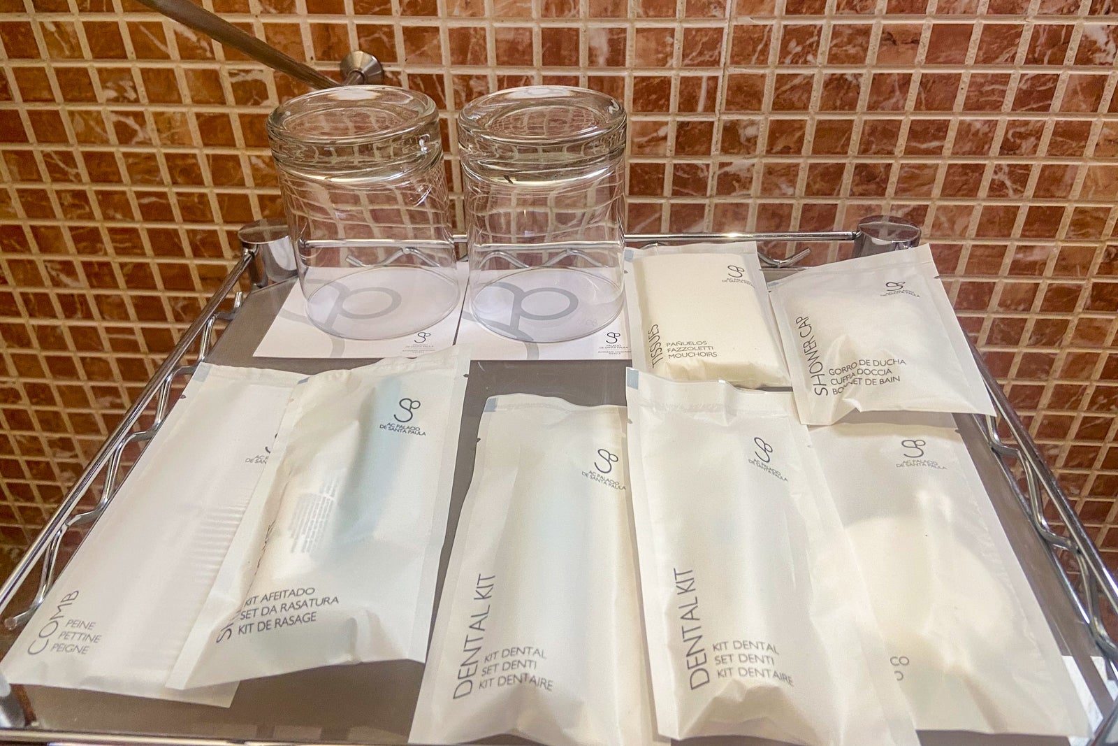 The bathroom had a small cart below the sink with toiletries and drinking glasses. Toiletries included a comb, shaving kit, dental kit, tissues, shower cap and makeup sponges.