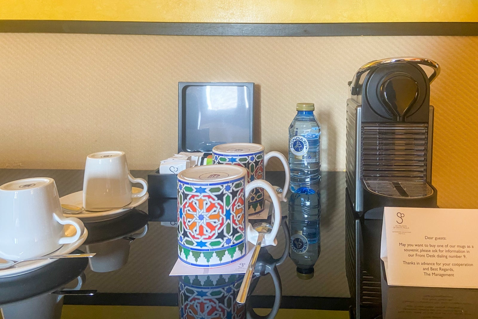 While I was less than impressed with the front desk service when checking in, the restaurant service made up for it. The wait staff during the evening flamenco show was pleasant and prompt. When ordering my glass of cava, the amount left in the bottle was not quite enough for a full glass; however, the server returned with a new bottle to top me off. And during breakfast, the staff was courteous in seating me, presenting and explaining the a la carte menu and remembering my room number when I returned for the second morning.