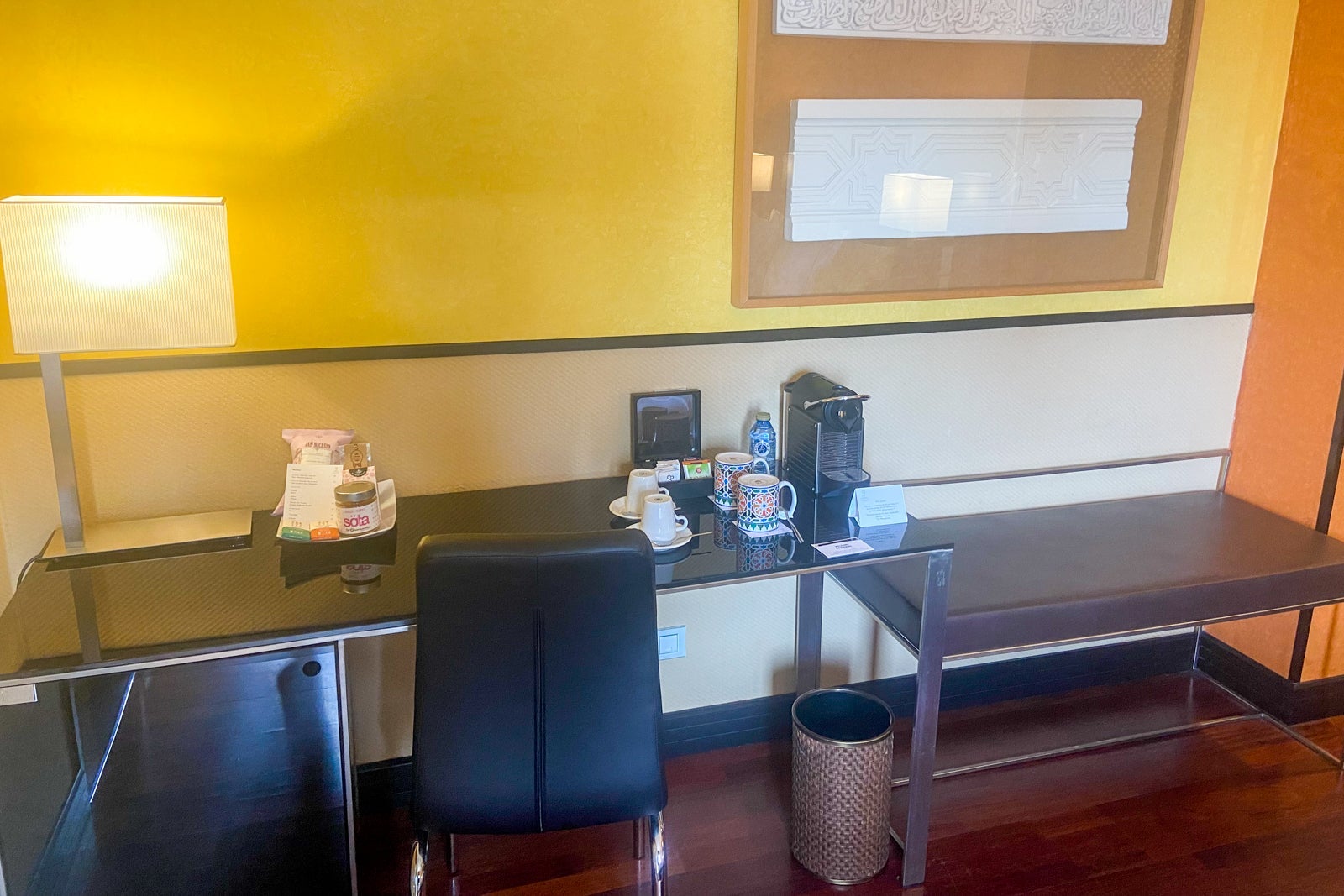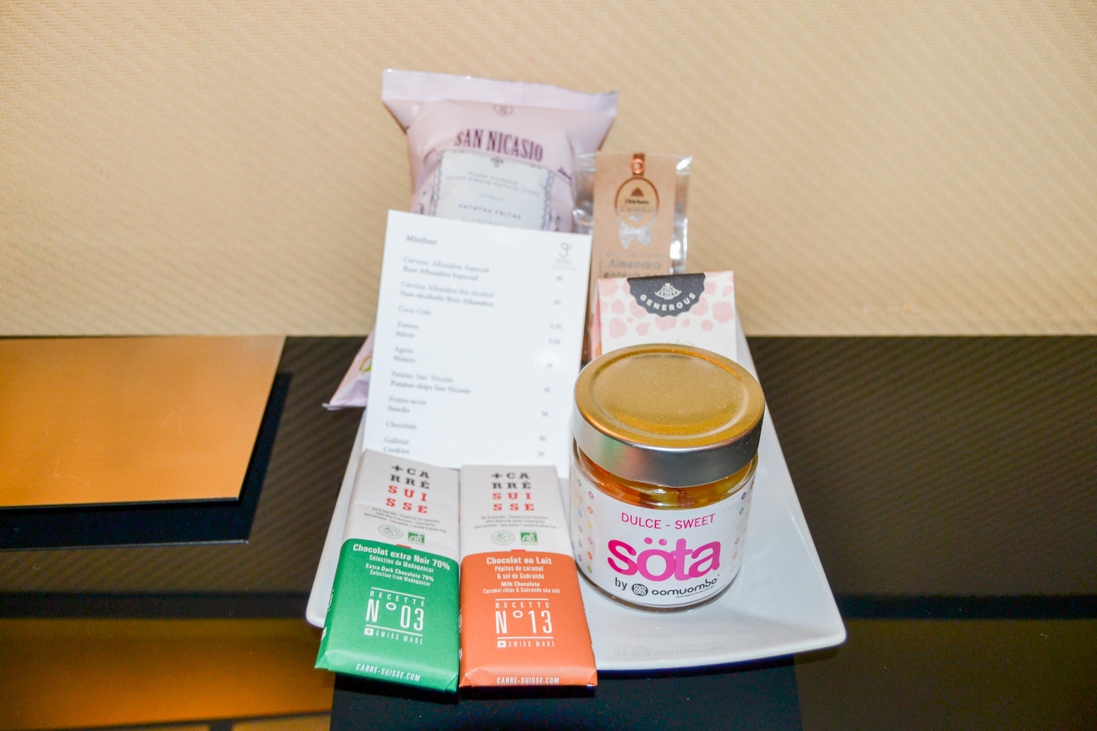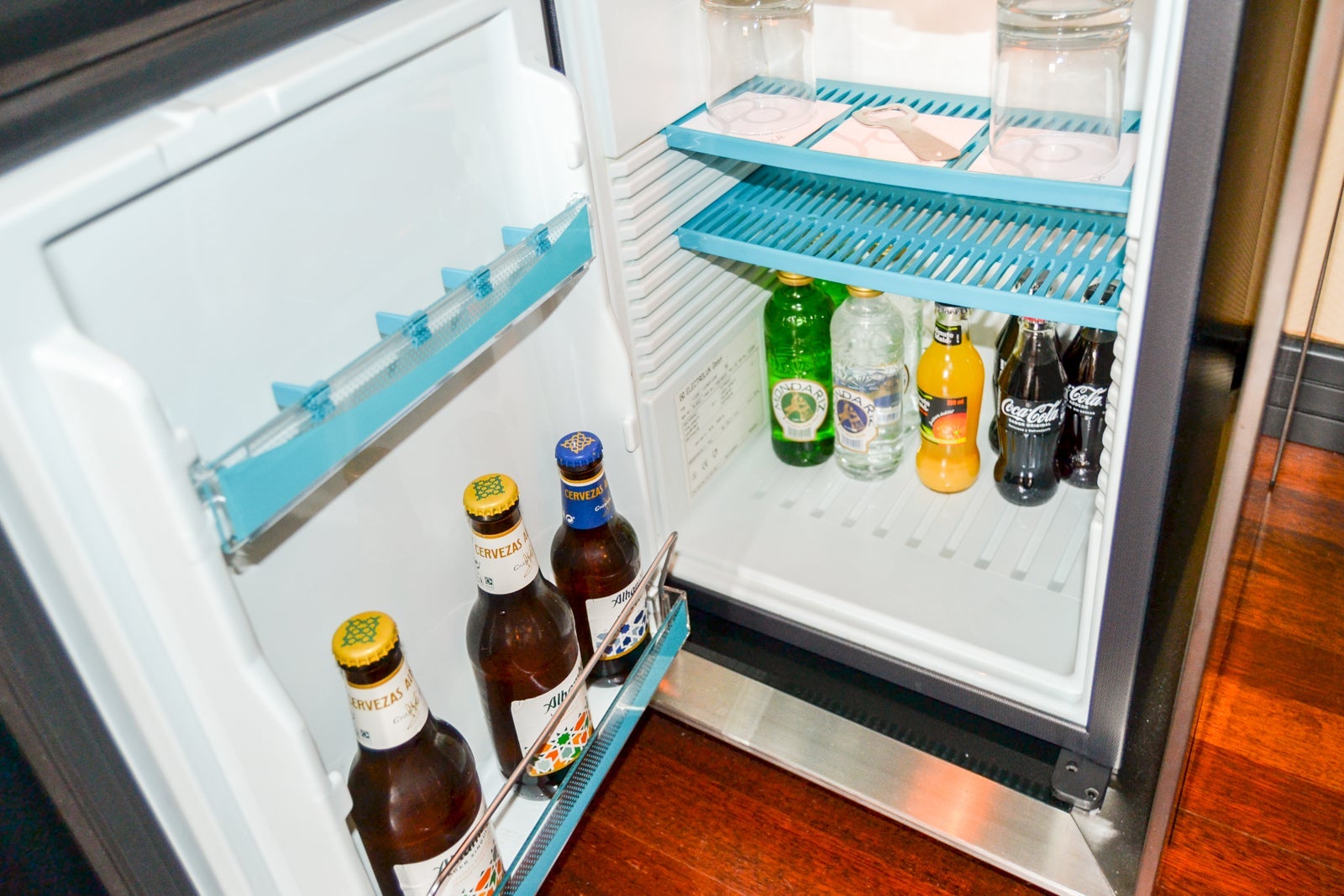 The minibar fridge was stocked with sodas, water, juice and beer, and snacks on the desk were available for purchase. A price list for minibar and snack items was also on the desk. Thankfully, there were three complimentary bottles of water in the room, two on the nightstand and one on the desk next to the coffee maker.