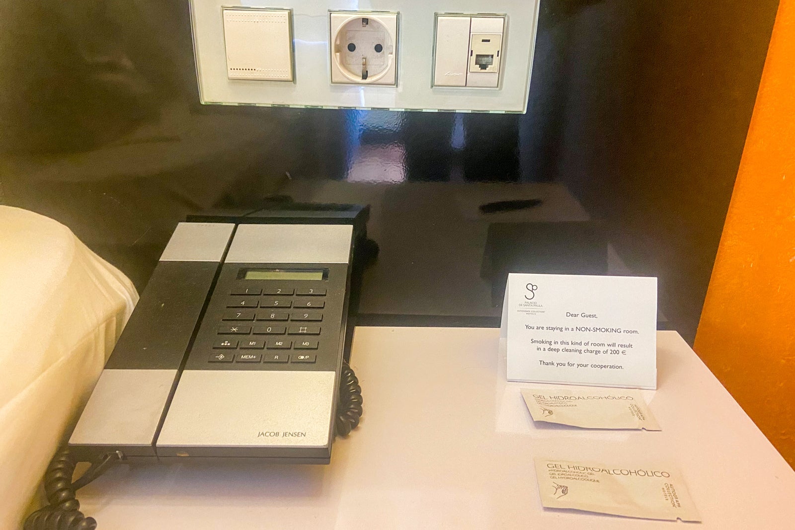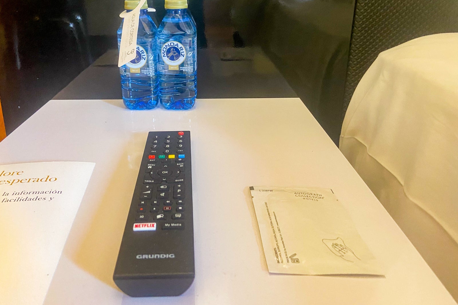 With its long, visible cord hanging down, the TV seemed awkwardly located on the wall at a fair distance from the bed. Or, if you were sitting at the desk and wanted to watch television, you'd be craning your neck to look up. Now, I didn't travel to Spain to spend a lot of time watching TV, but sometimes I turn on the TV to watch the news or have some background noise in the room as a solo traveler.