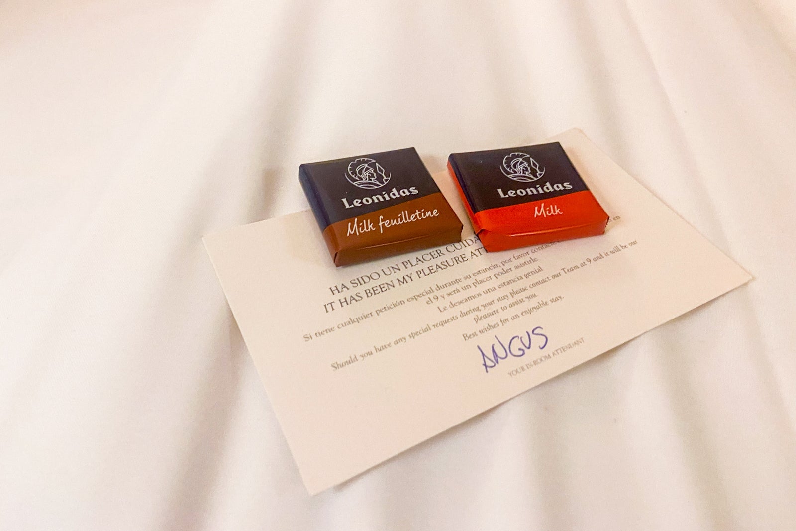 On the first evening of my stay, while I was away from the room, I received turndown service from housekeeping, and two chocolates were left on the bed. On the next evening, I was in the room when housekeeping knocked — the housekeeper asked if I needed anything for the evening, and I said no, so she gave me two chocolates and left.