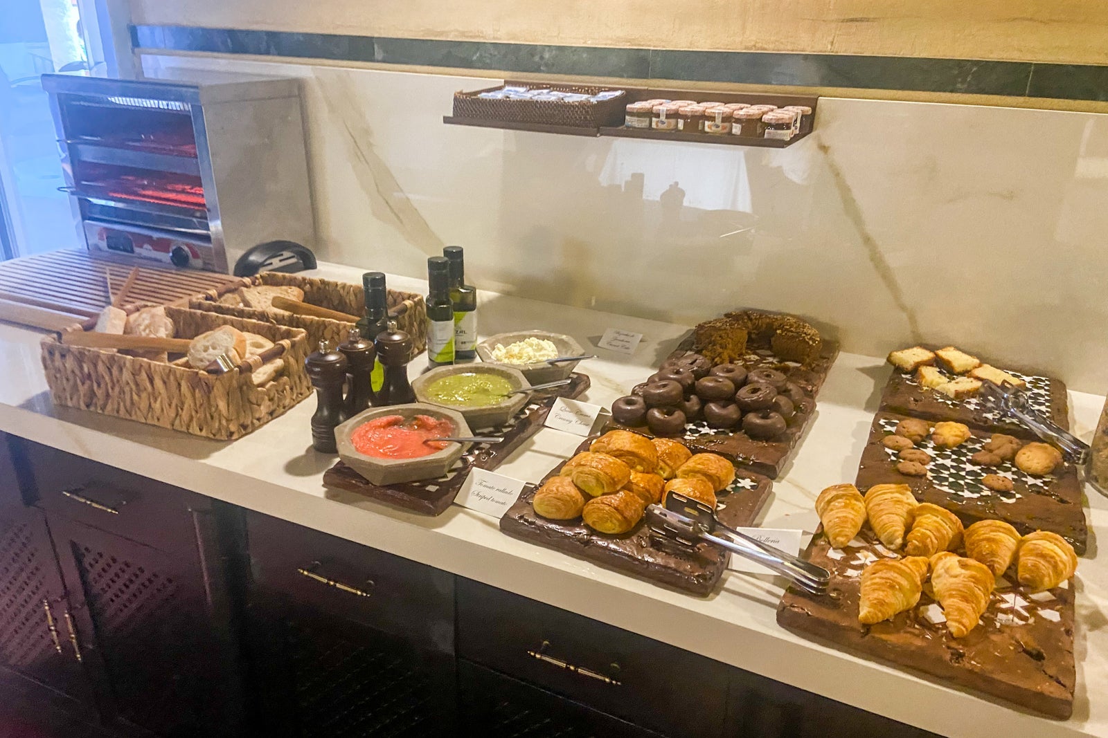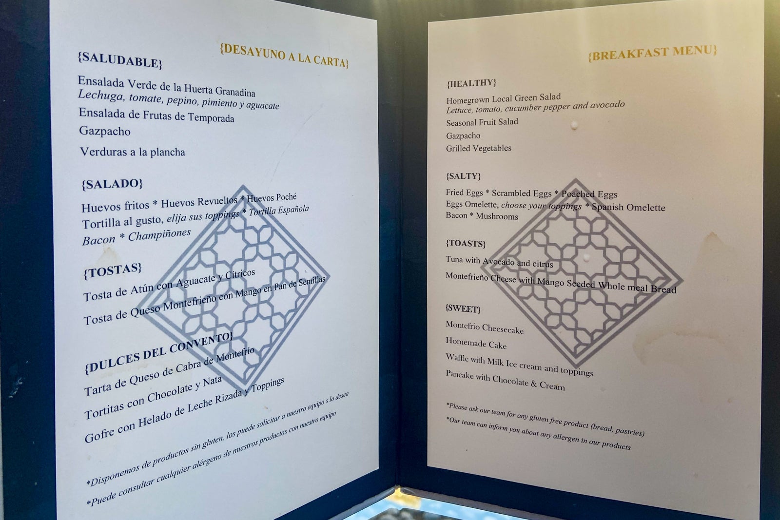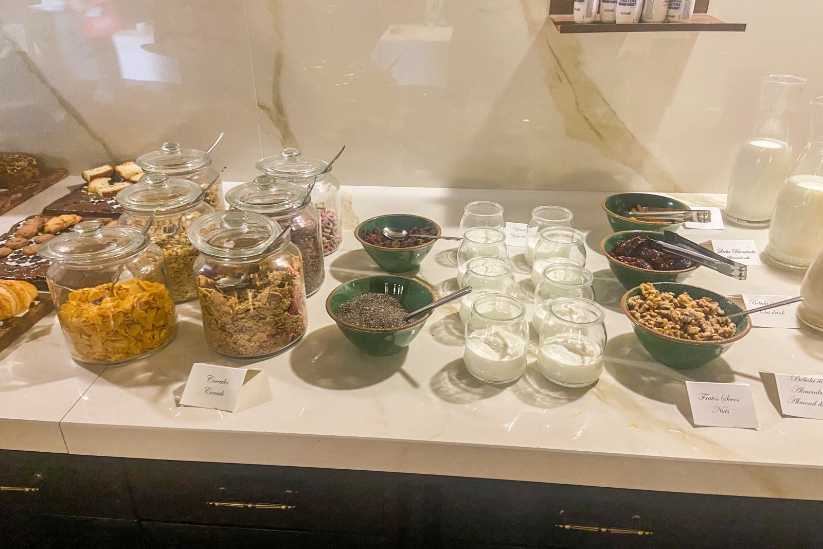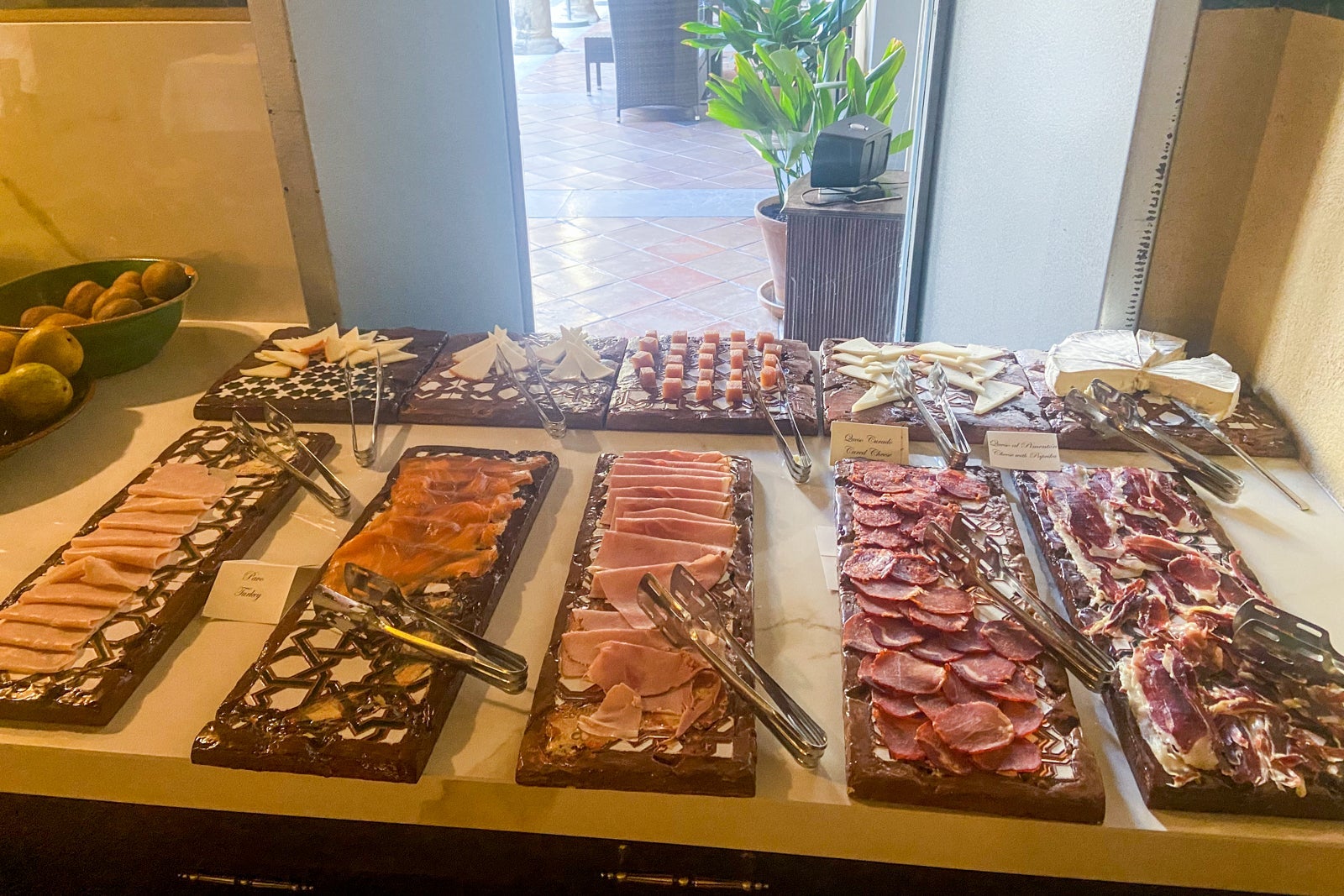 Breakfast was a buffet with fruit, cheese, cold Spanish meats, pastries, cereal and yogurt. Various juices and milk were available to drink, and a server offered coffee. The server gave me an a la carte menu to order an additional item at no extra charge, with salad, gazpacho, omelets, avocado toast, pancakes and waffles available.