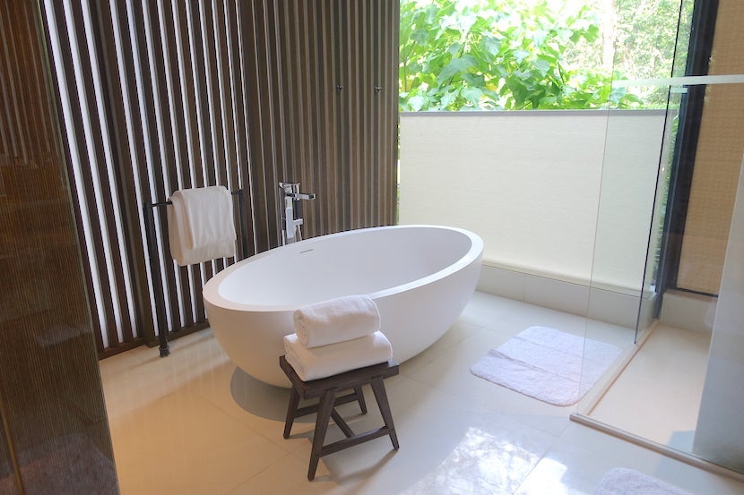 The bathtub was a large, freestanding soaking tub made of white marble and set by the window.