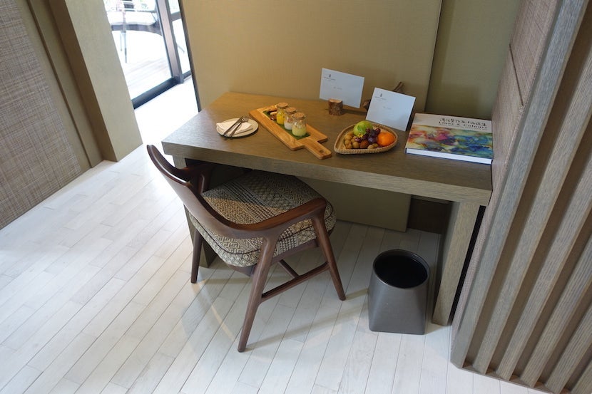 Along the wall separating the bedroom from the living room was a narrow table with a welcome layout of fresh fruits and three different tropical fruit puddings. I wouldn't call this a desk, as it was not convenient for working and there were no power ports.