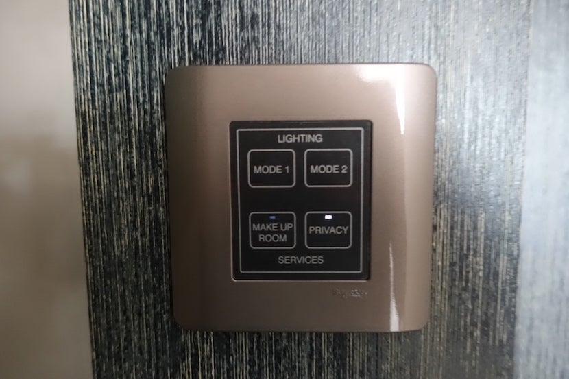 Inside the door was a short foyer and to the right was the closet and bathroom. There was a control panel by the door with buttons for the lights as well as settings for do not disturb and housekeeping.