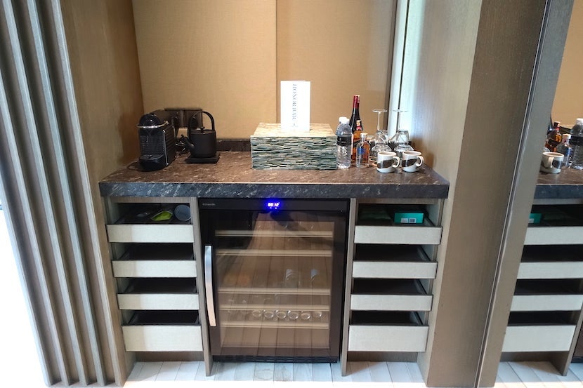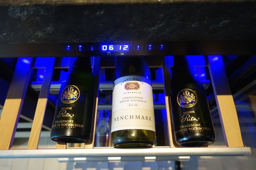 There was a wine refrigerator stocked with a bottle of red and a bottle of white (for about $40 each, which is pretty reasonable for Asia), Ritz-branded Champagne and other beverages.