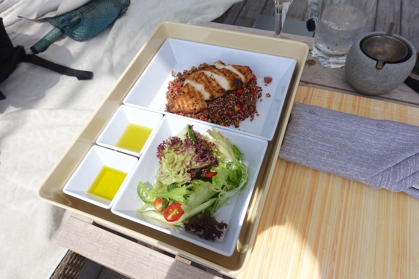 My first day, I came to sit by the pool and ordered quinoa salad with chicken for lunch, which was light and healthy. Along with a glass of wine, the total came to about $50.