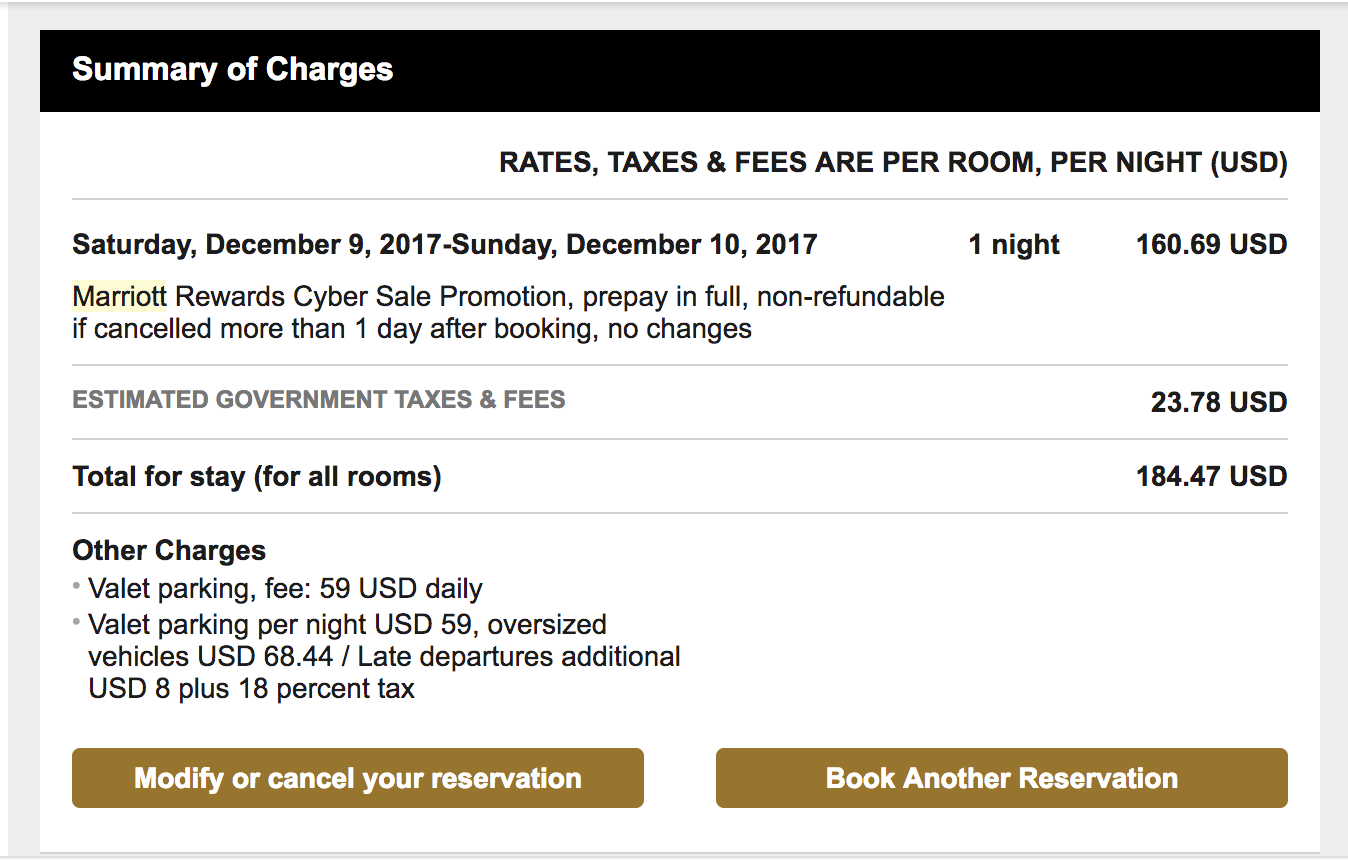 I took advantage of Marriott's (now expired) Cyber Monday sale and booked my room for $184.47 after taxes. This was a great deal, as prices at this property normally hover in the range of $250 to $300. If I'd been using points, this Category 8 property would have cost 40,000 points per night, worth $360 based on TPG's most recent valuations.