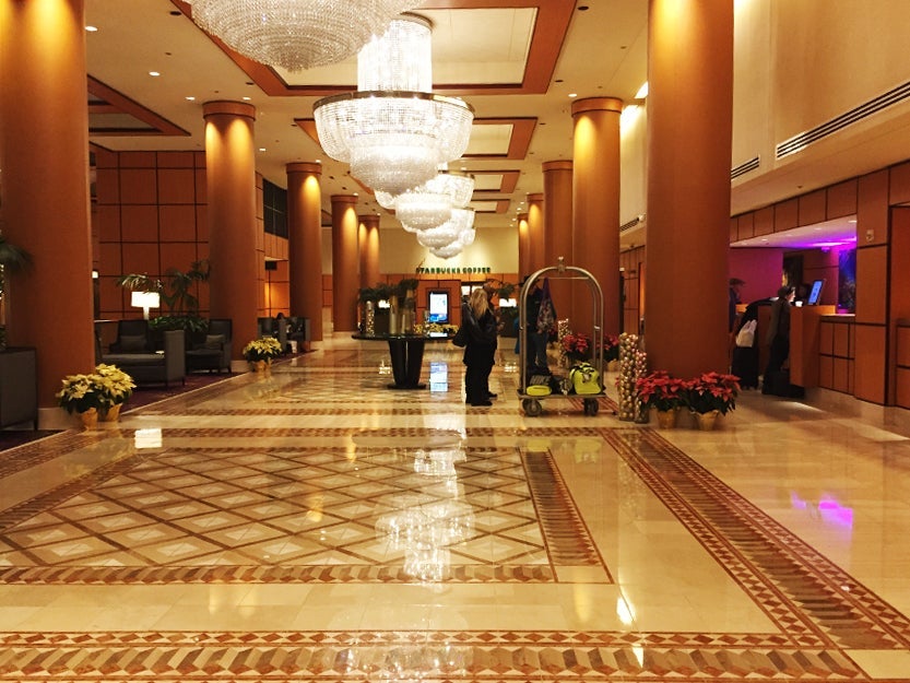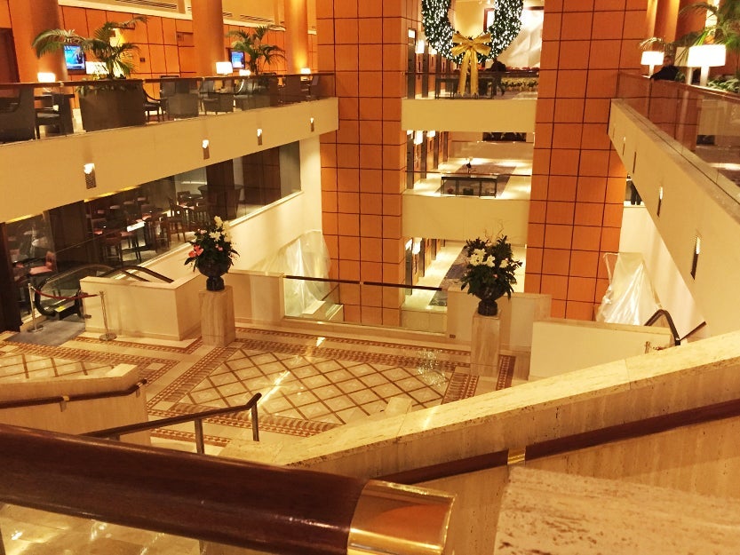 Once inside, we found ourselves in a long rectangular lobby with an open view of the restaurants on the lower floors, glass chandeliers and no fewer than a dozen Christmas trees.