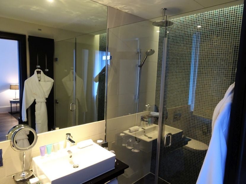 The real delight was the bathroom, with a robe hung over a warming rack, a roomy shower with fantastic rainfall and handheld heads, and enormous bath towels. But the counter space was minimal — I travel light and I still didn't have enough room — and the illuminated mirror didn't illuminate.