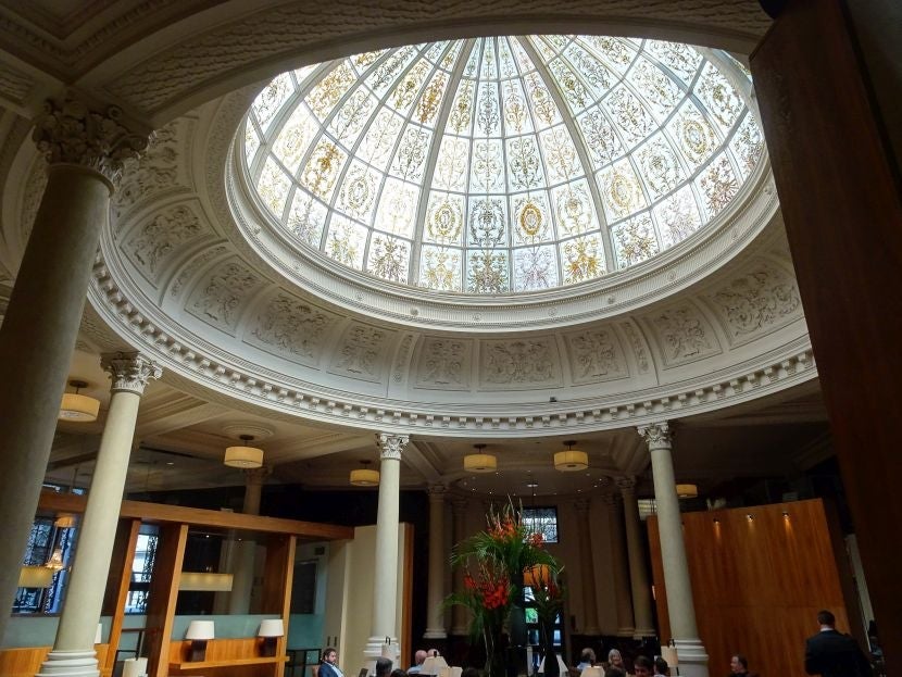 There was no one at the front to open the door or help with bags, but it was just a few steps from the entrance to the front desk. The lobby area was striking. Headlined by a stained-glass dome atop circular columns, this was an impressive place to meet your friends or colleagues for a drink, either under the dome or in the adjoining bar and restaurant. With cut marble floors, dark wood walls and smart lighting, Threadneedles made a great first impression with its rich and handsome design.