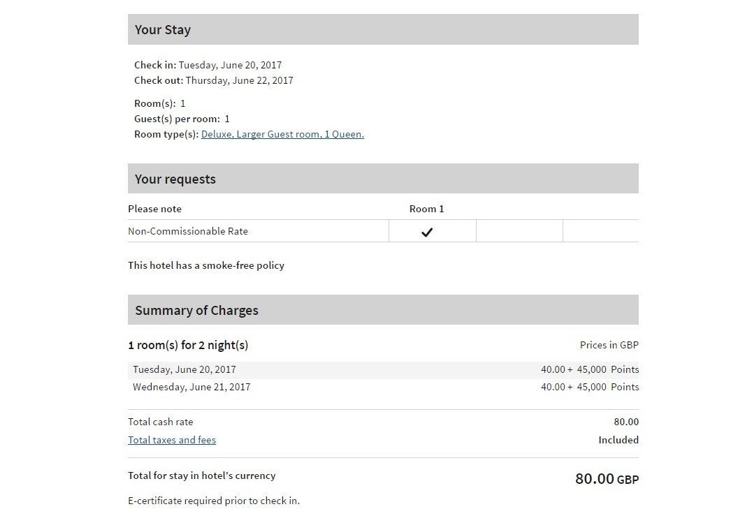 There was no queue, and I sat in a leather chair as the cheery staff offered water and checked me in. They thanked me for my Gold Elite status (a perk of having the Platinum Card from American Express is the Gold status with SPG, which Marriott will match). The Gold Status also got me a 4pm checkout and would have gotten me entrance to the hotel's executive lounge, if it had had one. Instead, I got a choice of a breakfast buffet or 750 points/night. I chose the points, which were posted to my account less than two business days after checkout.Check-in continued briskly until I was asked to pay 80 GBP. Uh oh ... I had been so excited to book my free room that I failed to notice I hadn't done it for free — I had selected the deluxe room, which cost an additional 40 pounds ($52) per night in addition to the 45,000 points. Instead of asking to change, I figured $52 a night was a good deal for a deluxe room.I got better than a deluxe room, though. With my Gold Elite status, I was given an additional upgrade to an executive room.