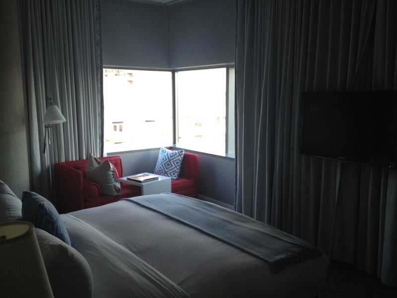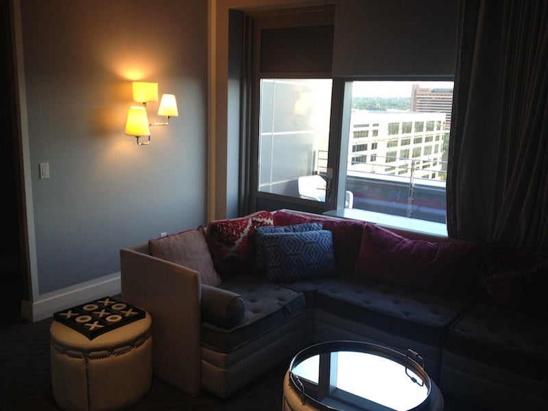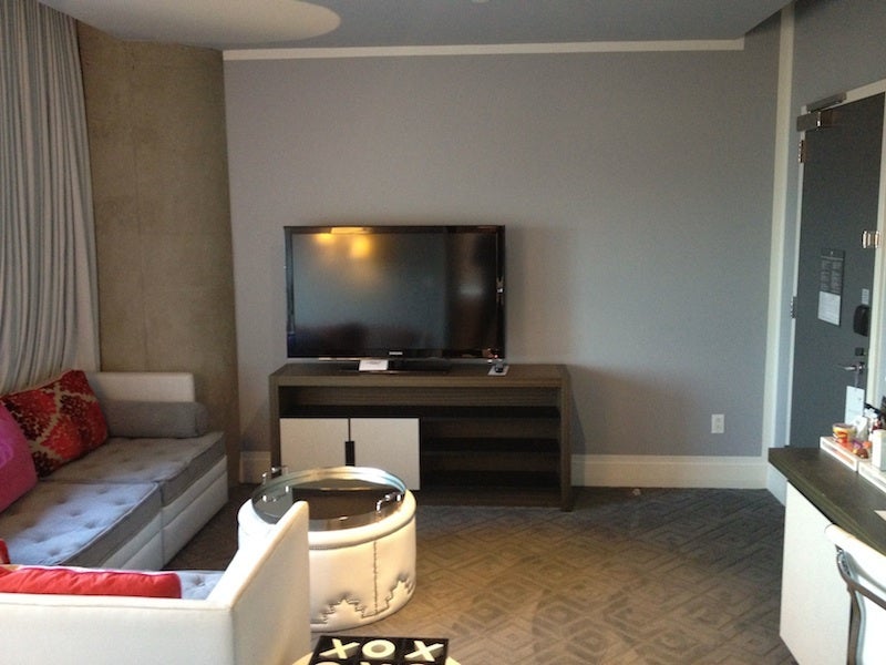 The Cool Corner Suite was indeed pretty cool and spacious with a smallish living room, separate bedroom and shower areas. A lot of W's seem to have a gray-on-gray-on-gray color scheme going on, but this room was bright and lively with lots of red, white and blue fabrics (very patriotic/Texas) and plenty of light from the corner windows.