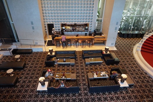 The lobby plays on Hollywood glamour with a dramatic spiral staircase covered in red carpet offset by a gilded wall and a chandelier dripping from the ceiling. The spacious Living Room lobby bar is found here with floor-to-ceiling windows and ample black, tufted leather banquette seating.