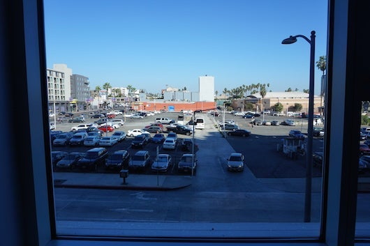 Perched beside the two large windows are makeshift window seats with gold vinyl cushions and pillows overlooking that surface parking lot where Melanie's car sat. The view is certainly not the highlight of this room, which is unfortunate considering a higher floor would have provided vantages of the Hollywood Hills and a neon-emblazoned skyline.