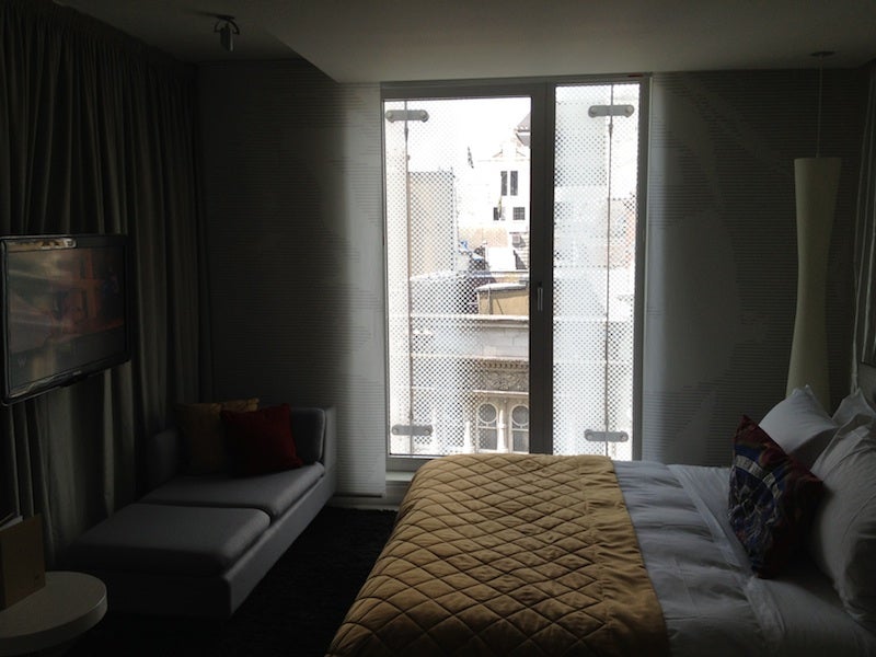 The room came with a signature W Bed, which I always love, and a gold duvet which I thought was a cool, cheeky touch (as was the "keep your wig on" throw pillow). It also had a small chaise lounge just under the wall-mounted flatscreen television, a small minibar. The screen print on the far wall where the window was was also cool, with two women's silhouettes, hearkening back to London's fashion roots.