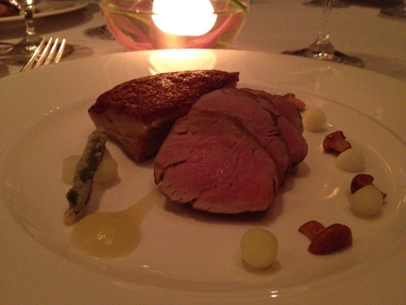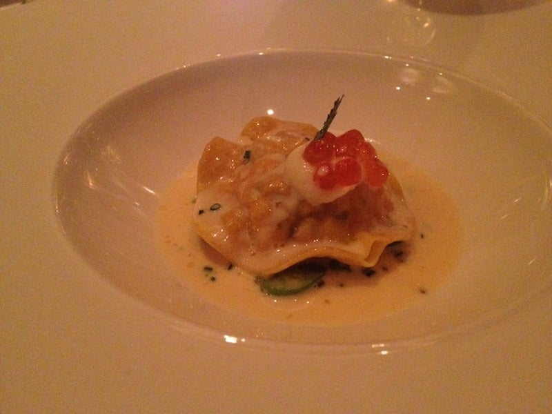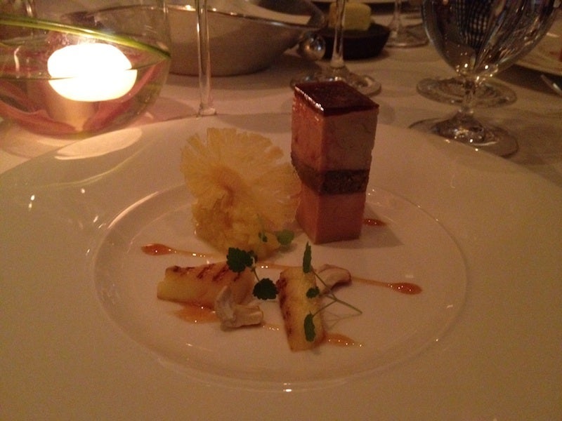 The tasting menu contained courses like pressed foie gras and confit duck with Scqchuan glaze and char-grilled pineapple and cashew nuts, lobster-salmon ravioli with peas and broad beans in a champagne-chive veloute, and fillet of smoked Casterbridge beef with braised celery, almonds and cherry sauce.
