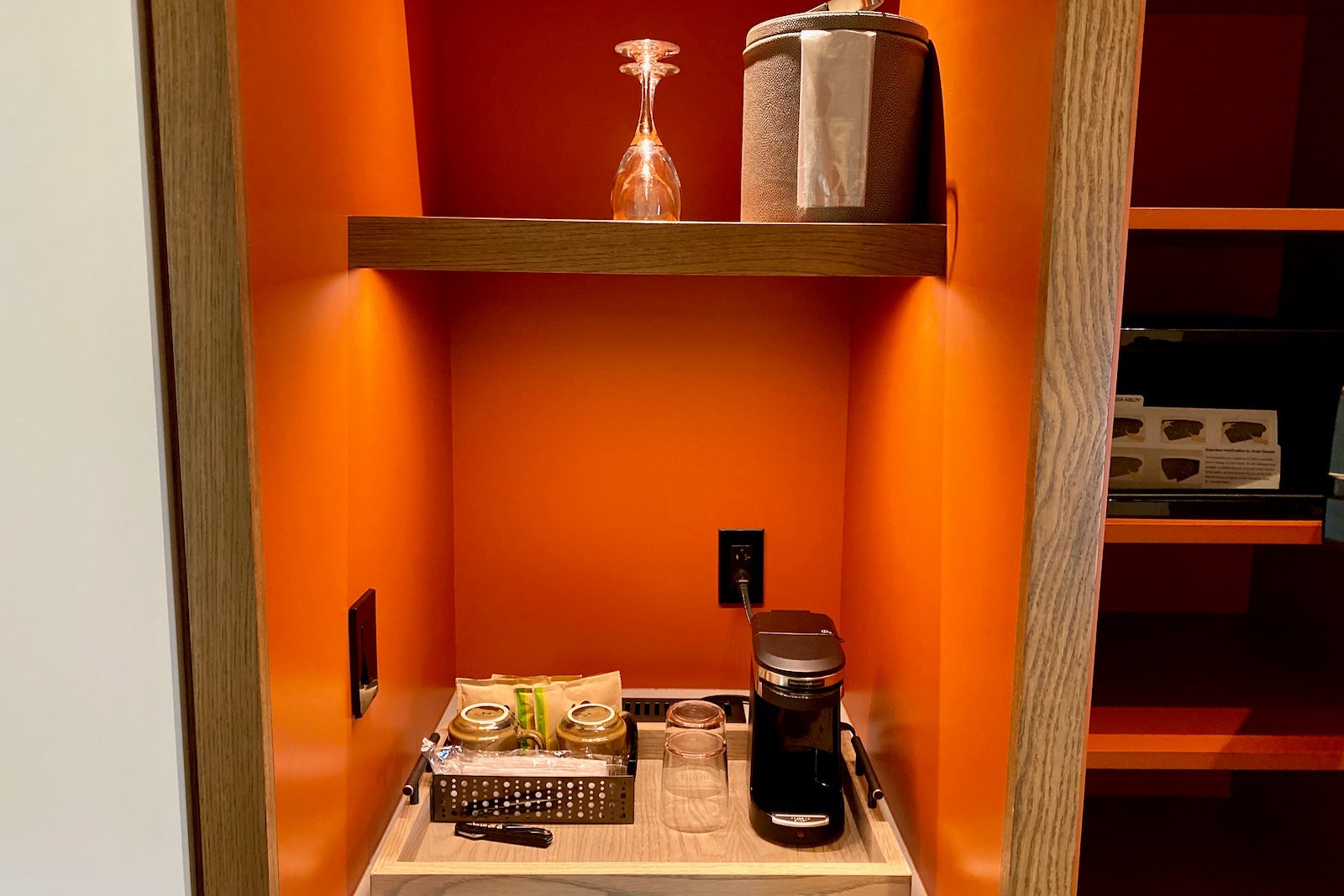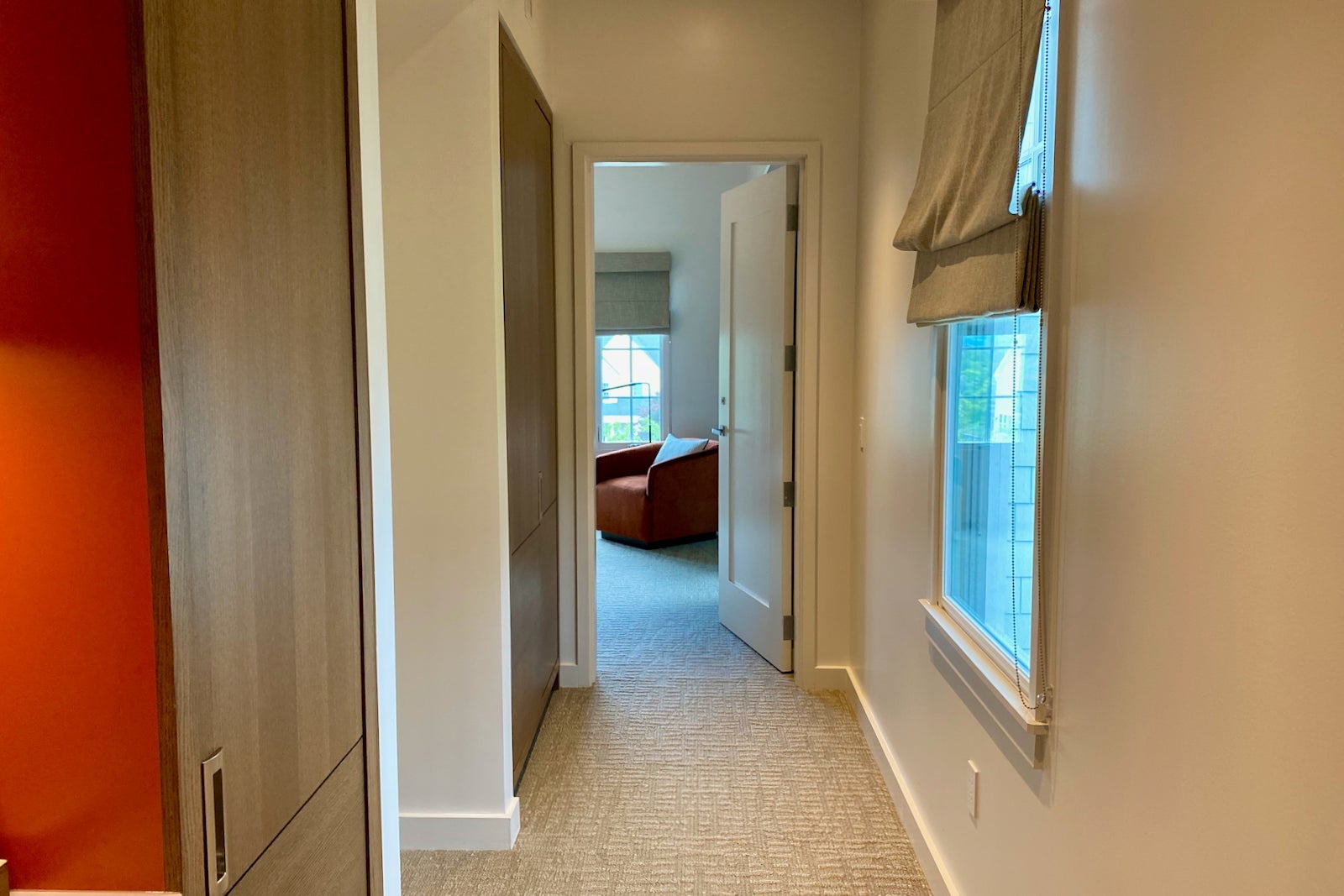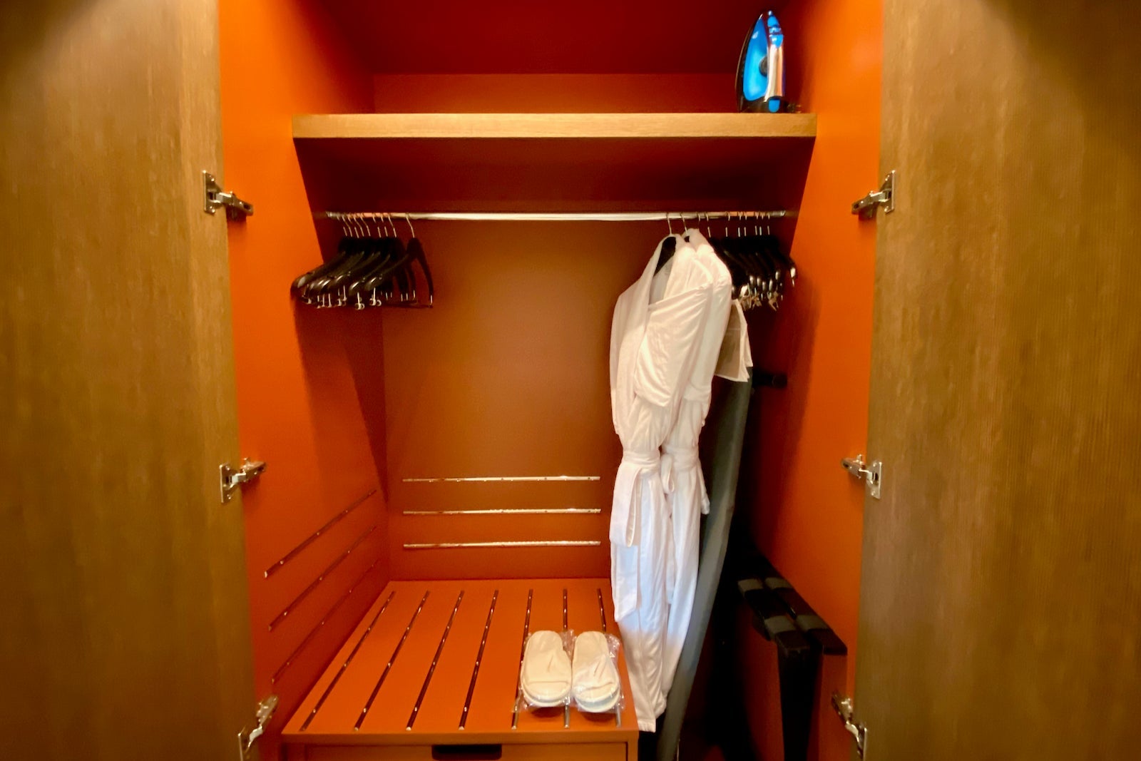 Along the hallway were two closets with a safe, fridge, coffee machine and refrigerator.