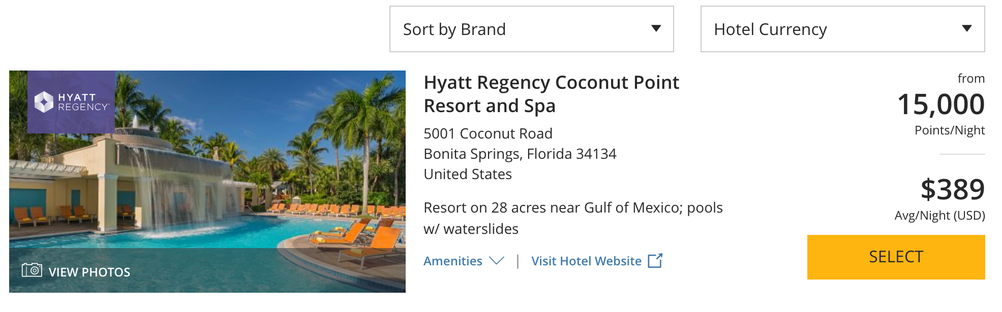 There is also a nearby Hyatt Residence Club property called Bonita Springs Coconut Plantation where you can book studios from 20,000 World of Hyatt points per night, but award availability is much more limited than at the Hyatt Regency Coconut Point. If you're paying with cash, there's more availability and you can book up to two-bedroom units.