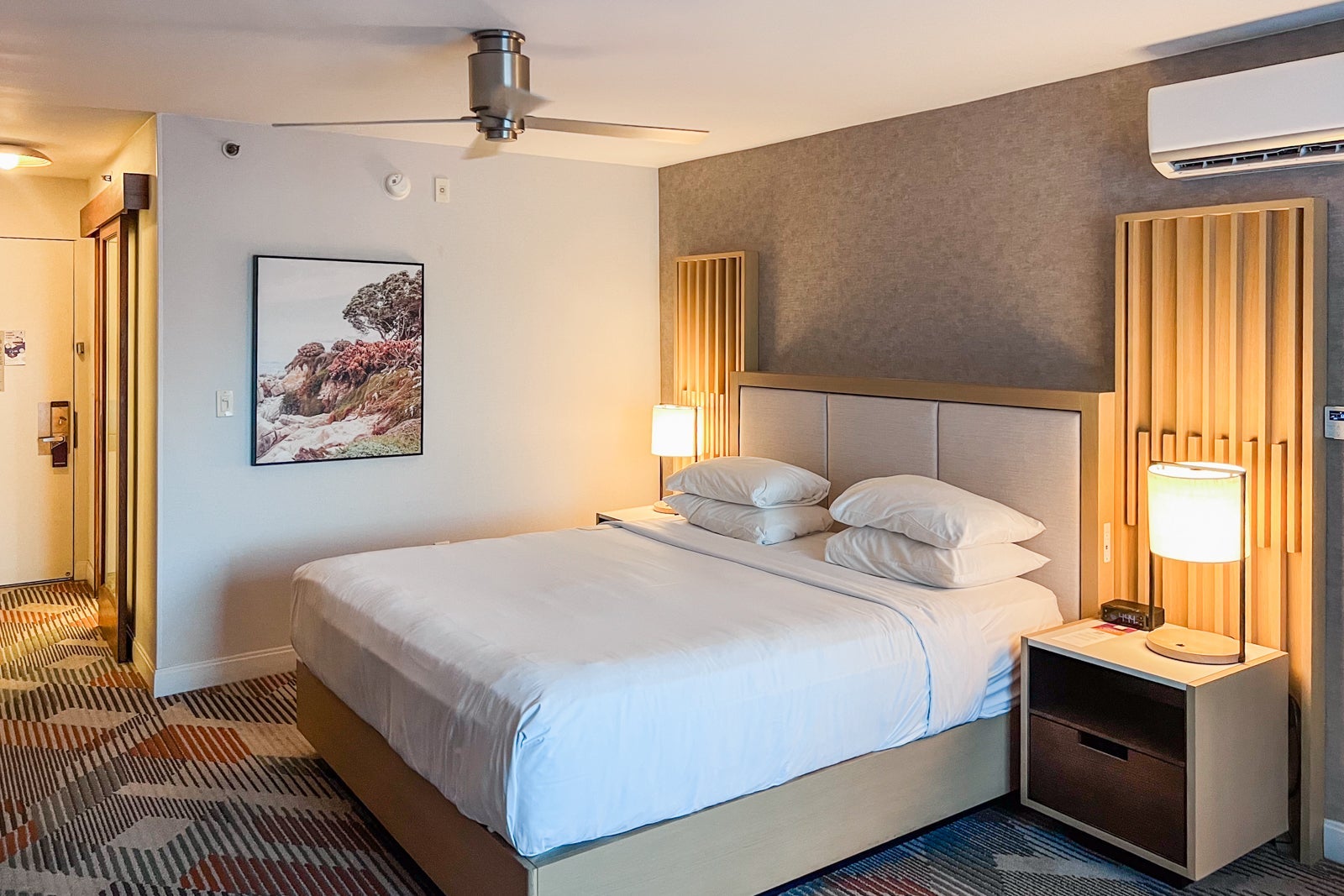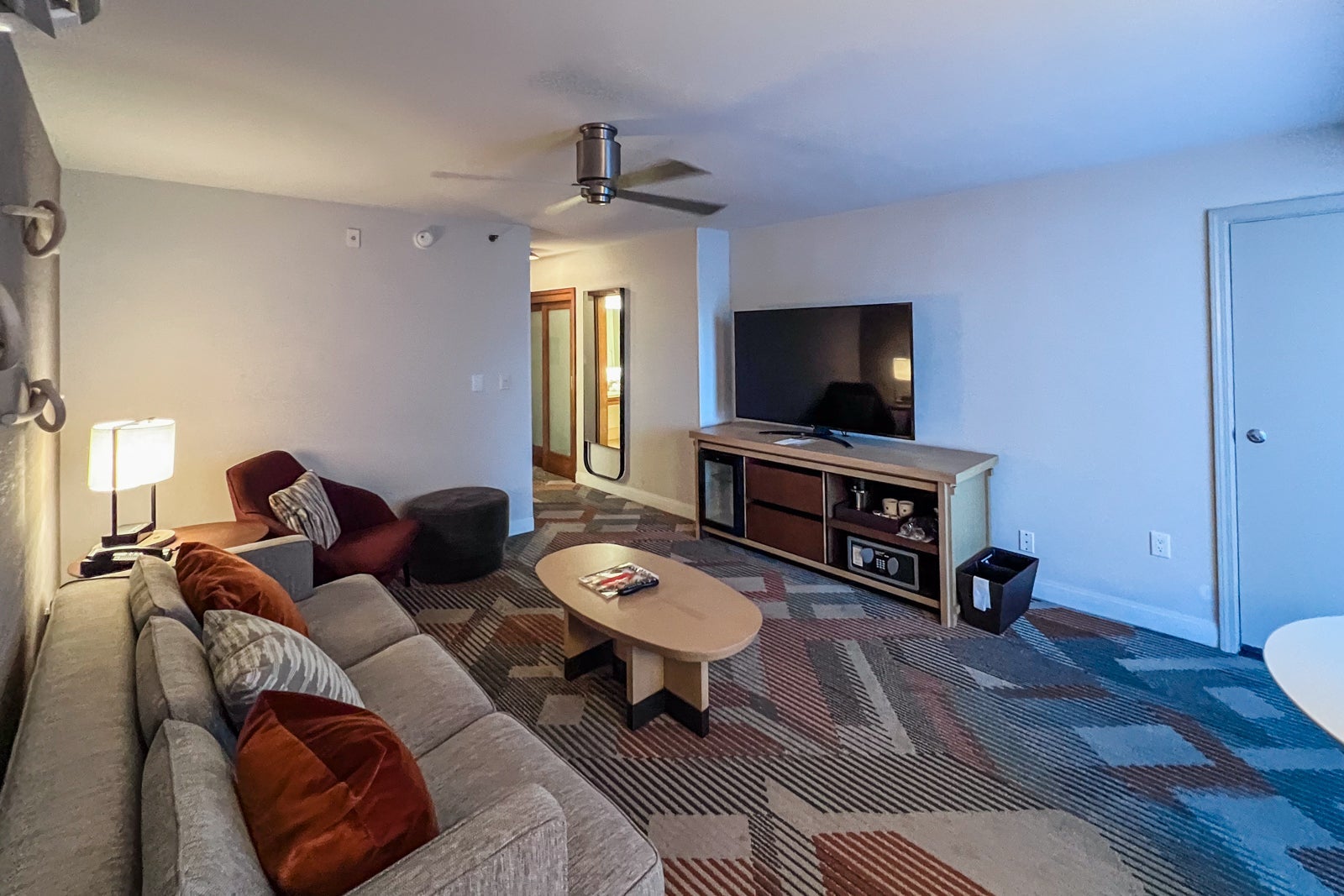 I stayed in a Monterey Suite One King Bed accommodation for the duration of my stay. My suite was in a building just off the swimming pool area closest to the lobby, so it was very convenient. The suite was actually two adjoining rooms with the doors propped open, and one room had been fashioned into the living area with a pull-out couch and small dining table, while the other room was the sleeping quarters with a king-sized bed and small seating area. There were coffee makers and mini refrigerators on each side of the suite. The bedroom setup featured plenty of built-in electrical outlets on each nightstand.