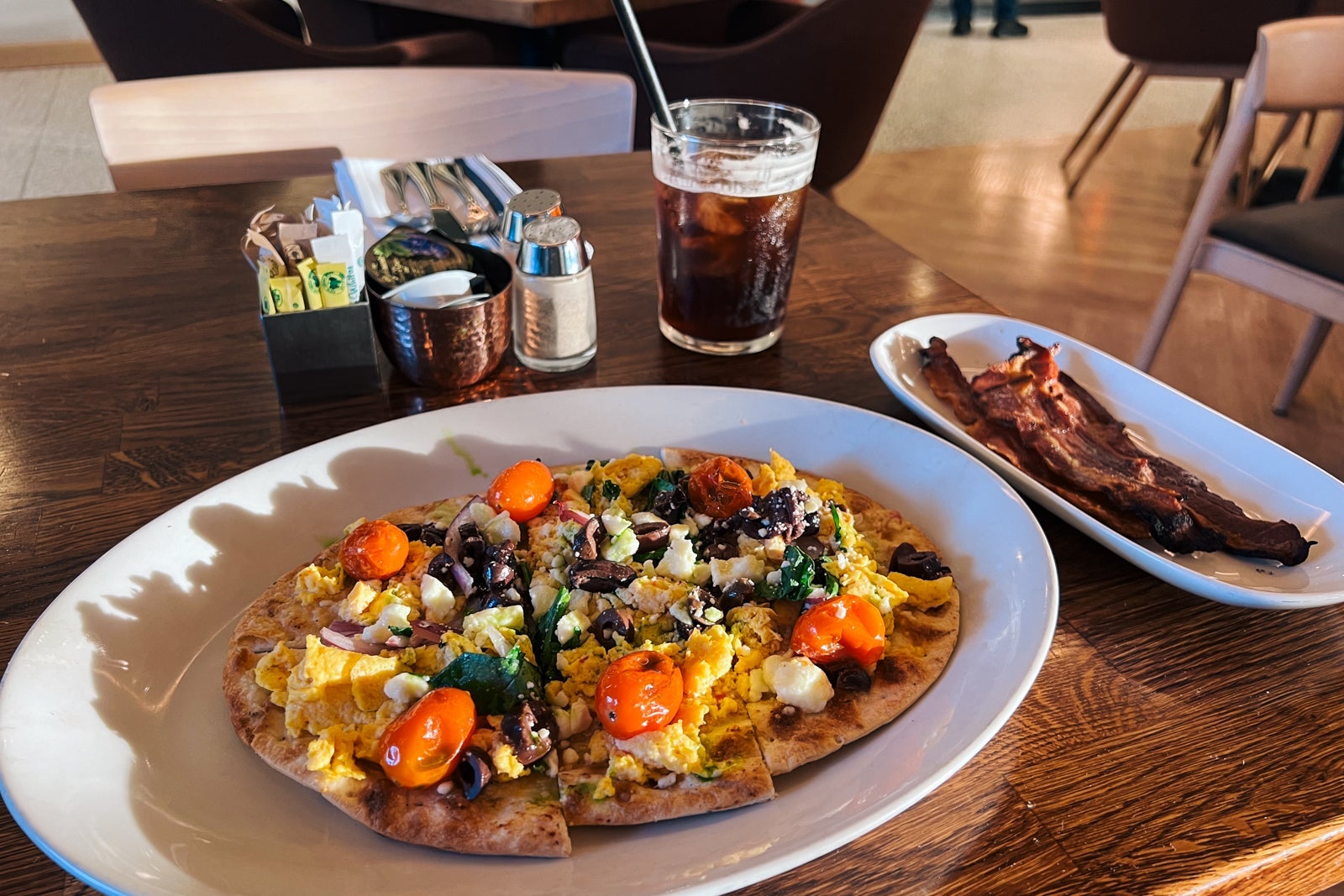 The herb focaccia starter ($5) came highly recommended, so I jumped at the chance to carb-load in the name of research. I popped in for breakfast one morning to enjoy a Greek breakfast flatbread ($16) with eggs, kalamata olives, tomatoes, basil, spinach, red onion and feta.