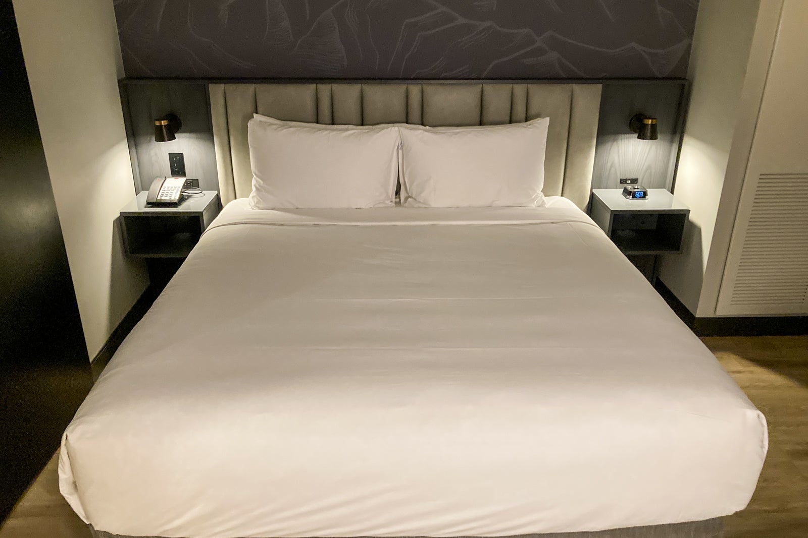 The room also had a small chair and table near the floor-to-ceiling windows, as well as a floor lamp and a large LCD TV. The bedroom did not have any overhead lights but instead relied on small lamps on each side of the bed to illuminate the space, plus a backlit headboard and a lamp near the TV. The combination of these was not enough to make the room feel bright after the sun went down in the evenings.