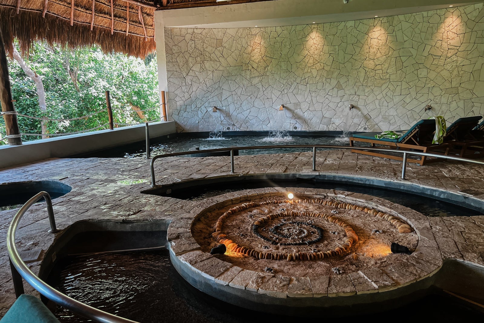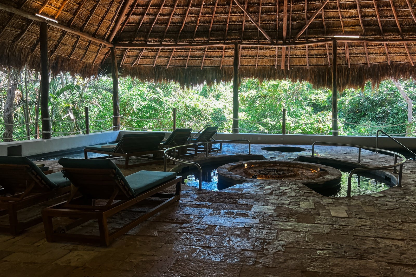 What separates this spa experience from others is that you actually arrive one hour prior to your appointment to indulge in hydrotherapy treatment. You are ushered into a locker room area to change into a robe to wear over top of your bathing suit and slides. Then my group of four other people and I were brought into a large indoor-outdoor spa that featured several plunge pools, a steam room, a sauna and showers. Overlooking the lush green Mexican jungle, it definitely was an elevated and memorable spa experience.