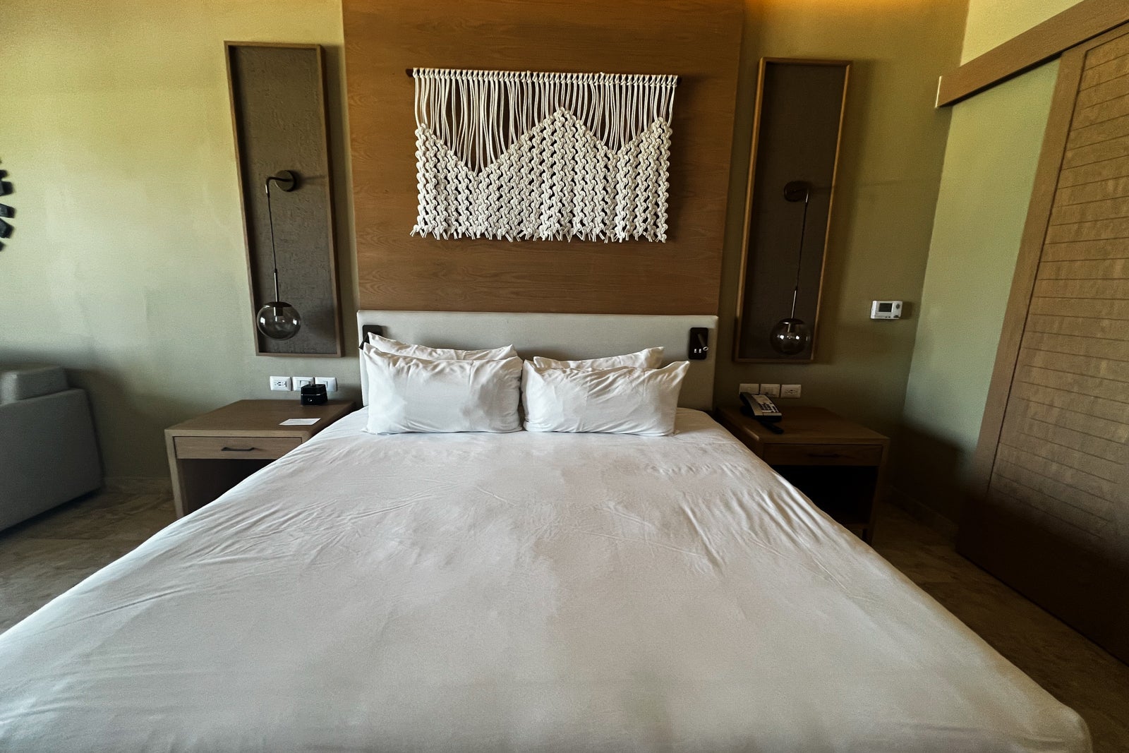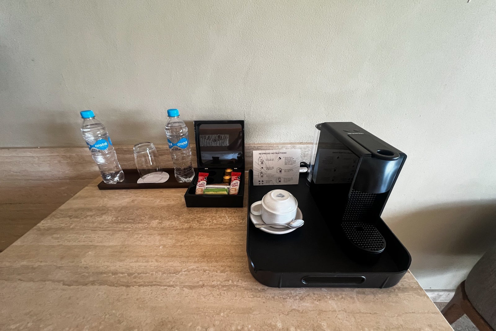 Inside the 678-square-foot Ocean Front Private Pool King room, you'll find a 55-inch HDTV, blackout curtains, a Nespresso coffee/tea maker, a hair dryer, an iron and ironing board, bathrobes and slippers, a couch, a small table with two chairs, an in-room safe and a minibar stocked with Tecate, water and sodas. I was surprised to find limited snacks in the room — my room only had one bag of plantain chips.
