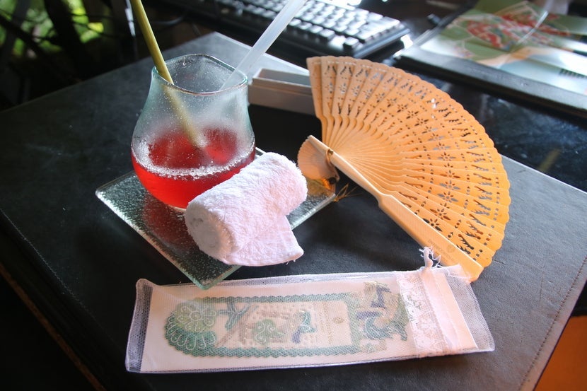 Check-in took place in an open office where we could sit down instead of having to stand at a regular check-in desk. We were also given delicious hibiscus welcome drinks, leis, wet towels, a fan and a bookmark.