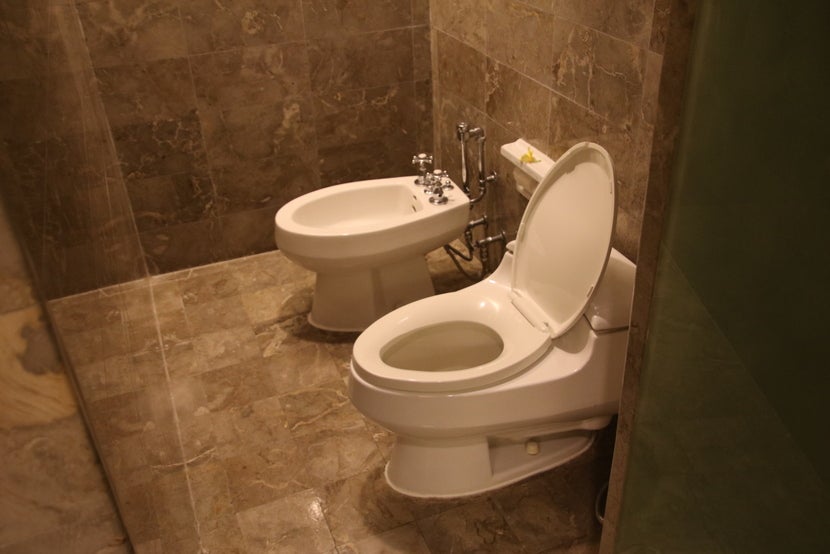 The toilet and bidet were kept in a separate but awkwardly-shaped room that was separated by a frosted glass door.